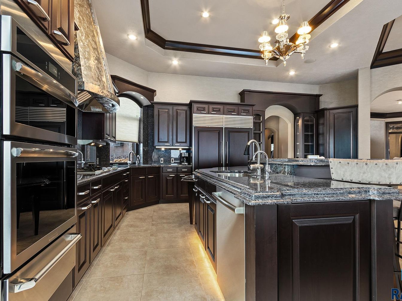 This well-appointed kitchen features rich dark wood cabinetry complemented by sleek stainless steel appliances. The spacious layout allows for smooth movement between areas, with a large granite island at its center, ideal for family gatherings and meal prep. Elegant pendant lighting hangs gracefully above, providing warm illumination. The double ovens and built-in coffee machine enhance functionality, while polished tile flooring adds sophistication. A contemporary backsplash and thoughtful storage solutions create an organized space. Large windows invite natural light, contributing to a welcoming atmosphere perfect for family meals and entertaining, showcasing both style and practicality.
