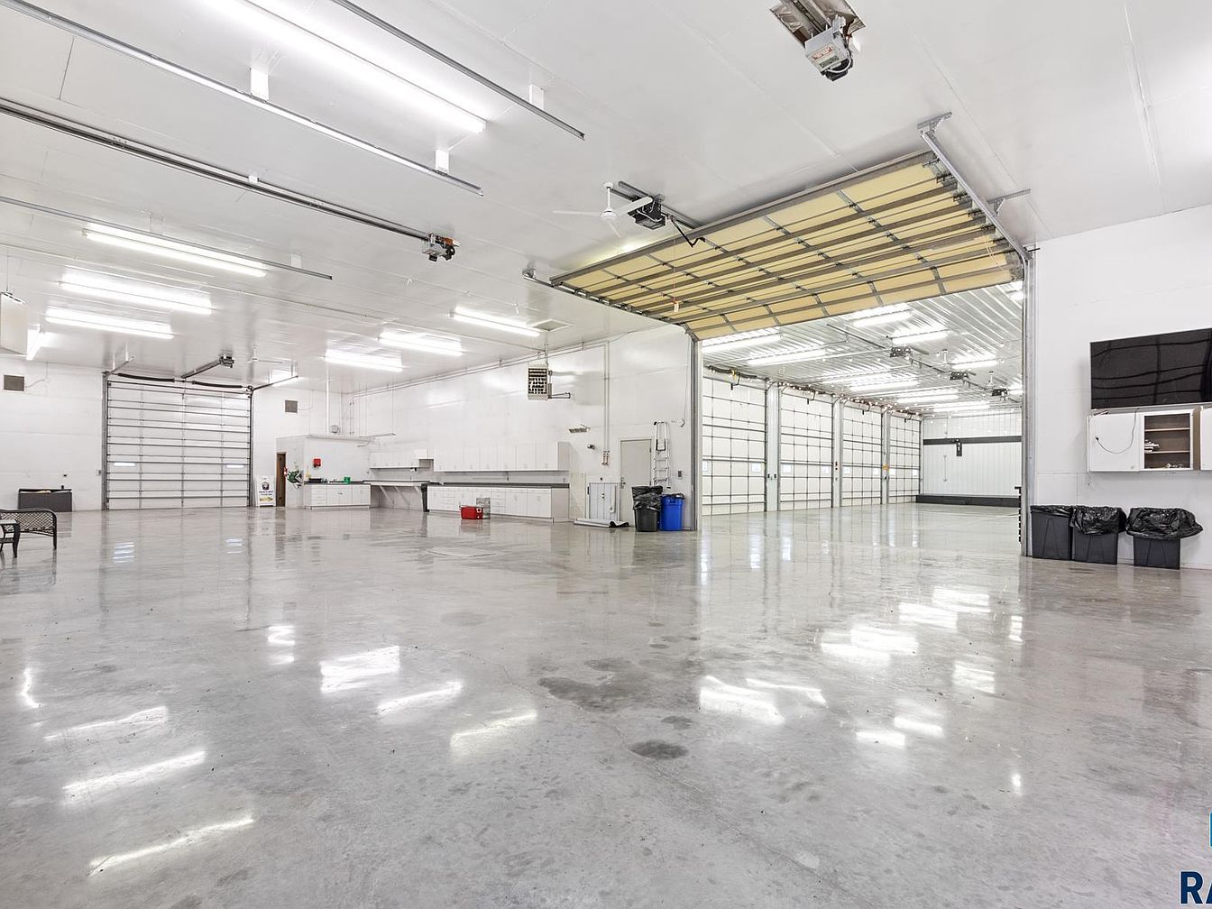 This expansive open garage features a sleek, industrial aesthetic with high ceilings and bright, fluorescent lighting that enhances the spacious feel. The polished concrete floor reflects light, adding to the room’s openness. A large roll-up garage door allows easy access for vehicles or equipment, making it ideal for families with active lifestyles. On one side, a long countertop with built-in cabinetry provides ample storage and workspace for projects. The clean white walls create a modern backdrop, while open shelving offers practical organization solutions. Overall, this versatile area combines functionality with a minimalist style.