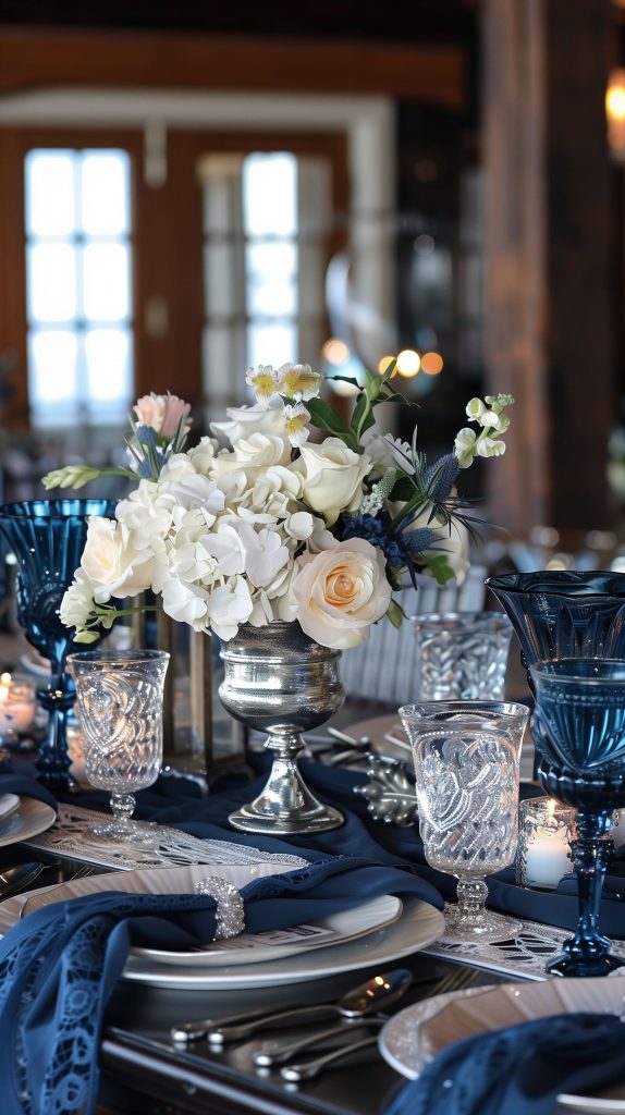 A seaside-inspired table with navy and white linens, seashell and starfish decor, rope accents, and anchor motifs. Nautical lanterns and ocean blue glassware complete the look.