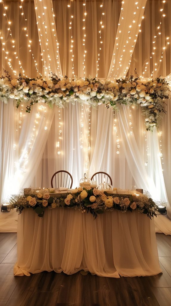 Transform your wedding with stunning Bride and Groom Table Design Ideas. Elevate your reception with a captivating backdrop of flowers, drapery, or lights.