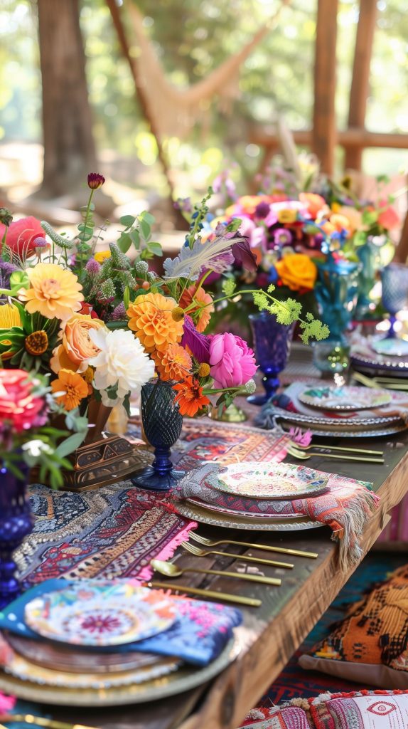 A boho-chic table featuring macrame runners, colorful glassware, vibrant flowers, and eclectic tableware. Floor seating with cushions and poufs adds a cozy feel.