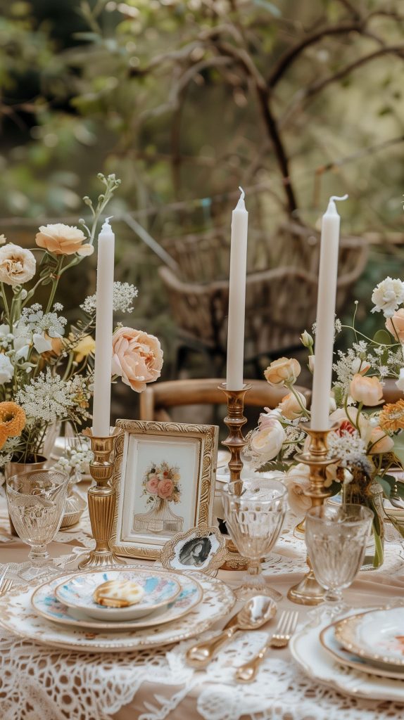 A vintage-inspired table with antique lace tablecloths, mismatched china, brass candlesticks, and pastel flowers. Vintage frames with old photographs are used as centerpieces.