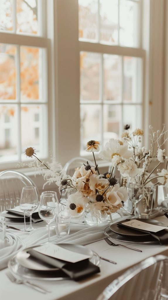A sleek, modern table with clean lines, monochromatic color scheme, geometric tableware, and minimalistic floral arrangements. Clear acrylic chairs add a contemporary touch.