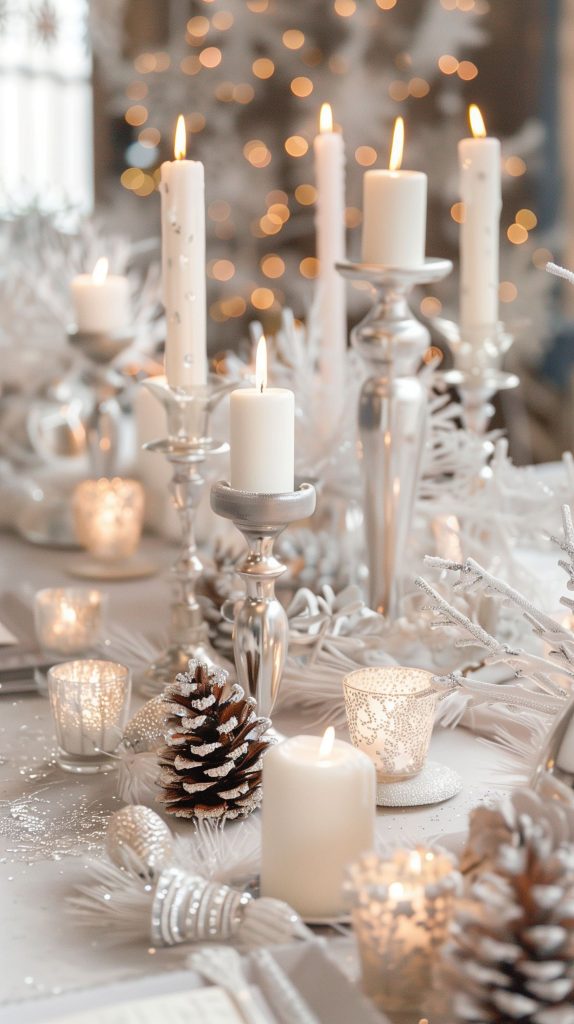 A magical winter-themed table with a white and silver color palette. Faux snow, glittering snowflakes, silver candlesticks, and pinecones create a winter wonderland effect.
