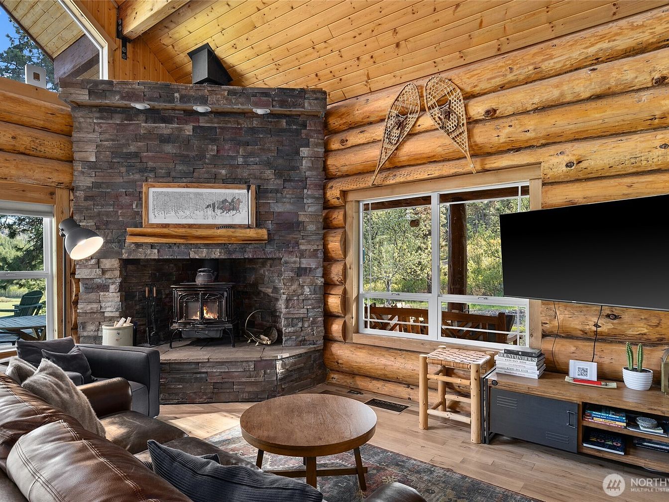Warm wooden log walls paired with a striking dark stone fireplace create a rustic yet refined centerpiece in this living area. The fireplace features a wood-burning stove beneath a substantial wooden mantel holding monochrome artwork. A pair of vintage snowshoes hangs above, adding character to the space. Natural light pours through a large window beside the TV, showcasing greenery outside. Seating includes a dark leather couch and a cozy armchair with plush cushions. A round wooden coffee table and a patterned rug unify the arrangement, blending modern comfort with cabin charm in this inviting room.
