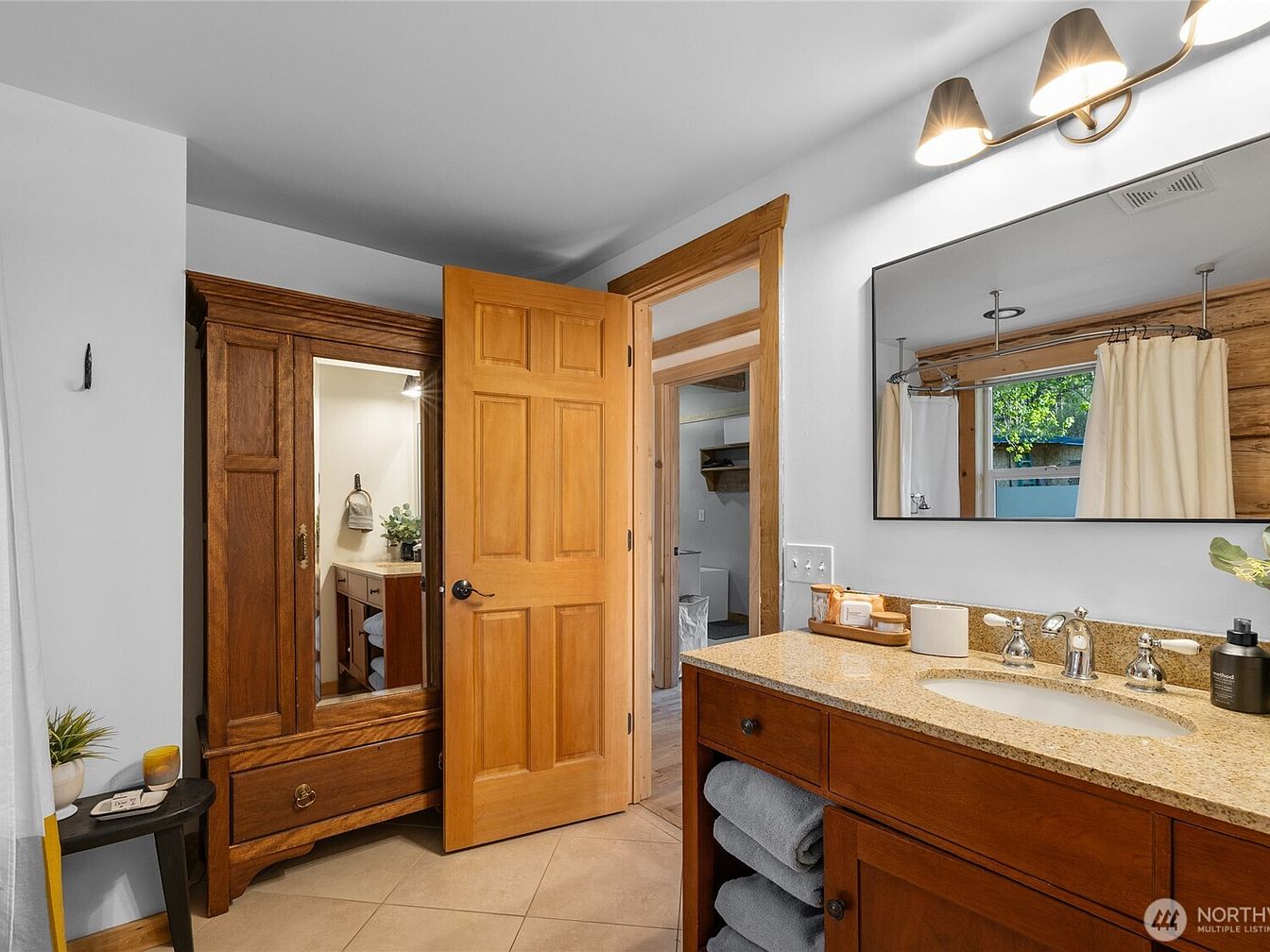This bathroom corner features a warm, natural aesthetic with wooden accents dominating the space. A granite countertop with an undermount sink sits on a rich wood vanity that incorporates open shelving for neatly folded towels. Above, a large rectangular mirror reflects the room’s light, enhancing the sense of space. The walls are painted a soft white, allowing the wood tones to stand out. A vintage armoire with a full-length mirror and detailed woodwork anchors the left side, next to a small black side table holding decorative items. The open door reveals another space, highlighting continuity in wood trim throughout.