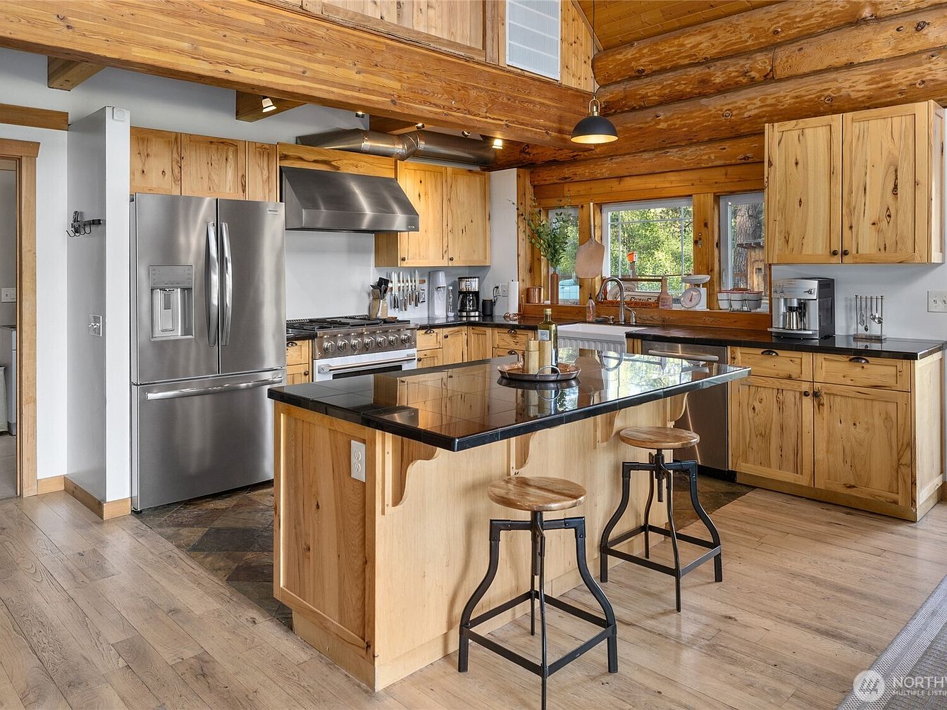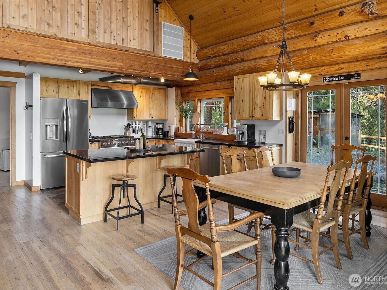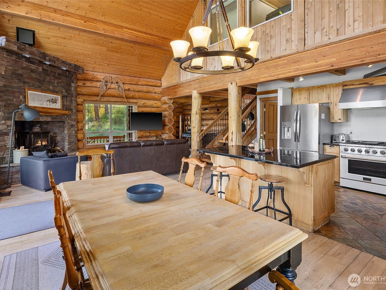 This open-concept kitchen and dining space blends modern functionality with rustic charm. Natural wood dominates the room, from exposed log walls and high vaulted ceilings to pine cabinetry and trim, creating a warm, cozy atmosphere. The kitchen island, topped with a sleek black countertop, offers casual seating with industrial-style stools. Stainless steel appliances, including a large refrigerator and professional-grade stove with a vent hood, add a contemporary touch. Adjacent is a sturdy wooden dining table paired with classic spindle-back chairs on a subtle patterned rug. Large glass doors provide abundant natural light and access to the outdoors.