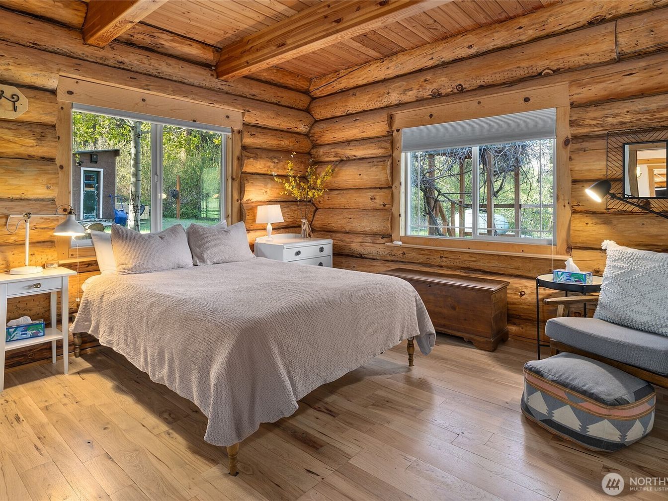 This bedroom combines rustic charm with modern comfort, set within a warm log cabin. The walls and ceiling reveal natural wood logs and beams, creating a cozy, inviting atmosphere. Light hardwood flooring complements the wooden structure. Large windows framed in natural wood allow abundant daylight, offering serene views of lush greenery outside. The bed is dressed in neutral, textured linens, accompanied by white bedside tables holding delicate lamps and a vase with yellow flowers. A cushioned chair with a patterned footrest adds a touch of softness, while a wooden storage chest lies beneath one window, enhancing the room’s functional elegance.