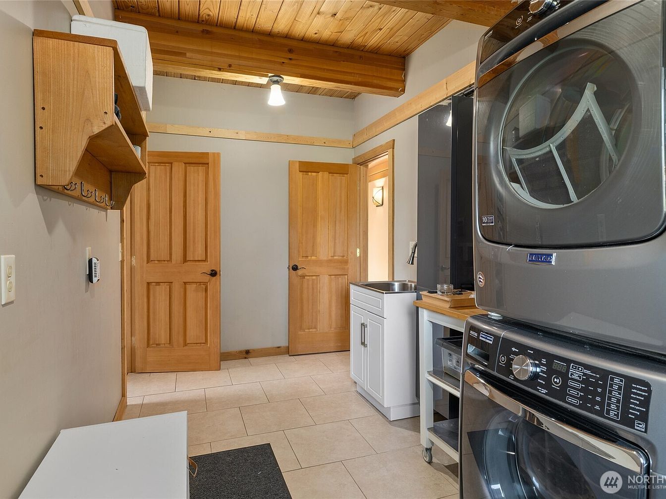 This laundry room blends functionality with a warm rustic touch, featuring a wood-paneled ceiling with exposed beams that complement the natural wood finish on the two interior doors. The floor is laid with light beige tiles, enhancing the room’s clean and practical vibe. On the right, a sleek black stacked washer and dryer unit stands, offering modern convenience. Adjacent to it, a compact white utility sink with a wooden countertop sits on a rolling cart, providing additional workspace and storage. A wooden wall-mounted shelf with hooks adds storage and organizational options, while neutral wall colors keep the space open and inviting.