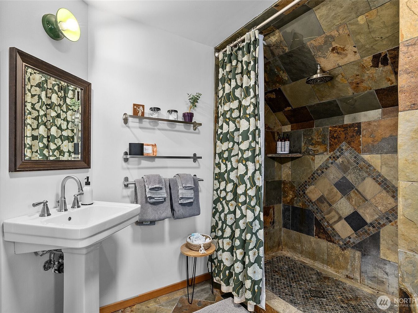 This bathroom features a rustic, earthy shower area with multi-toned stone tiles covering the walls and ceiling, arranged in a natural mosaic pattern with a distinctive diamond shape as a focal point. The walk-in shower is complemented by a floral-patterned green shower curtain adding a touch of nature-inspired charm. Opposite the shower, a classic white pedestal sink pairs with a dark wood-framed mirror and modern brushed metal fixtures. Functional shelving holds decorative items and toiletries, while neatly folded gray towels and a small wooden stool contribute to a balanced blend of rustic and contemporary styles.