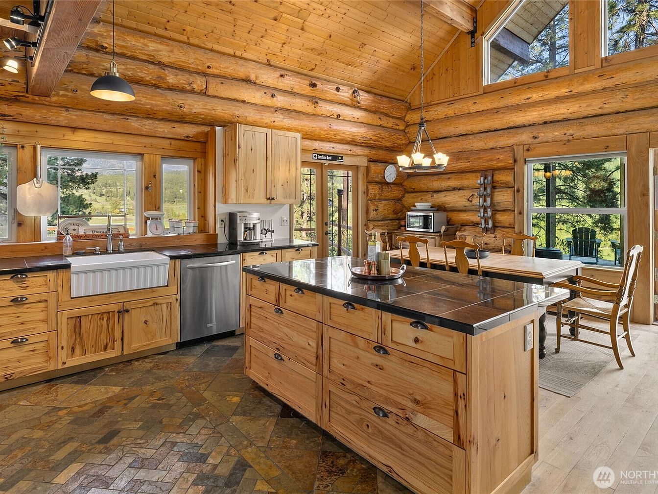 This warmly inviting kitchen features rich log cabin walls with exposed beams, enhancing its rustic charm. Natural wood cabinetry offers ample storage, topped with dark stone countertops that add contrast. A large central island serves both as a prep space and a casual dining area, highlighted by ambient overhead lighting. Stainless steel appliances, including a dishwasher, complement the earthy tones while maintaining functionality. The farmhouse sink beneath wide windows brings in natural light, offering scenic views of surrounding greenery. Adjacent, a classic wooden dining table with spindle-back chairs sits near expansive windows, brightening the space and connecting indoor comfort with outdoor tranquility.