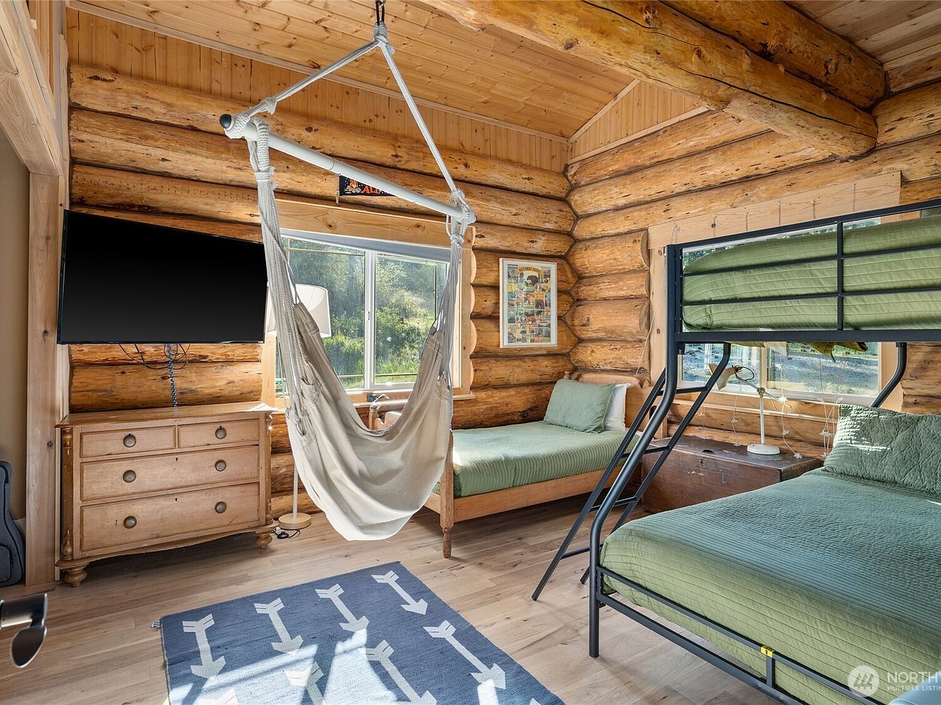 This bedroom features warm, rustic log cabin walls complemented by a light wooden plank floor. A bunk bed with a black metal frame and green bedding occupies one corner, providing both functionality and a natural color palette. Adjacent to it, a single bed carries matching green linens, enhancing the cohesive look. A natural wood dresser beneath a mounted TV offers storage, while a hammock chair suspended from the ceiling adds a distinctive, cozy seating option. Large windows allow ample natural light, brightening the space softly. The blue rug with white arrows adds a playful touch amid the earthy tones.
