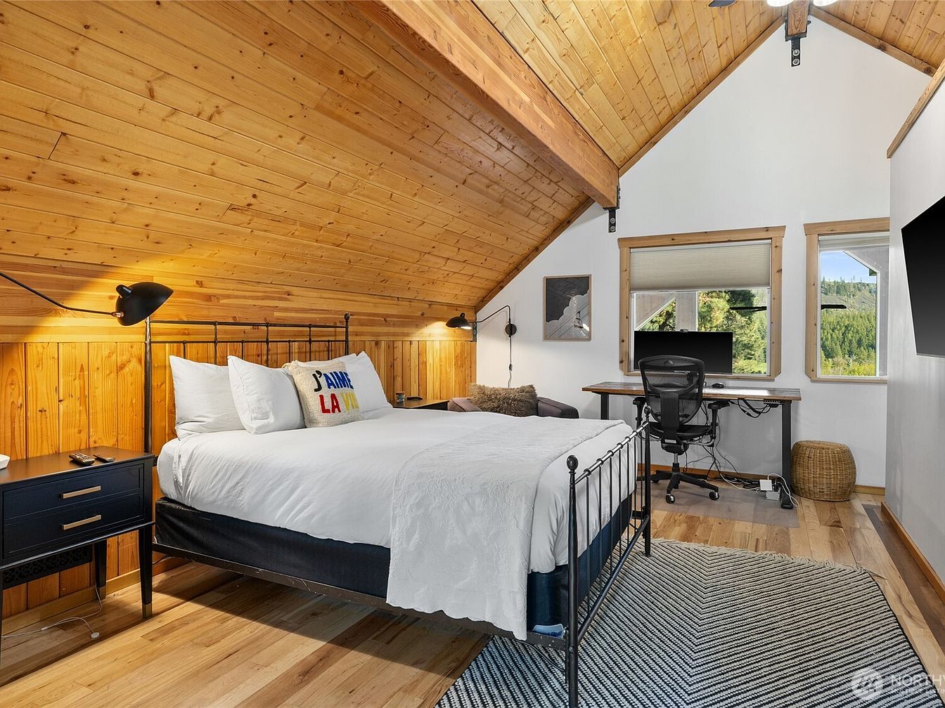 This loft bedroom features a steeply pitched wooden ceiling with exposed beams, creating a warm and inviting cabin-like atmosphere. The bed has a black metal frame with crisp white linens and a colorful accent pillow, flanked by two black nightstands with modern black wall-mounted reading lamps. The flooring is light wood, complementing the natural wood paneling on the lower half of the sloped wall. Two side-by-side windows bring in ample natural light and provide scenic views of lush greenery. A minimalist workspace with a black mesh chair and a large computer monitor rests against the far wall, emphasizing a blend of comfort and functionality. A monochromatic geometric area rug adds texture and modern contrast to the space.