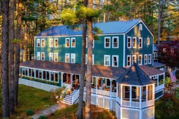 Expansive lake views, a commercial kitchen, iconic porch, two docks, and a cozy fireplace enhance this grand lakeside lodge.
