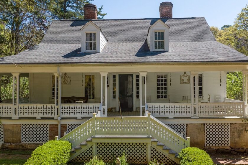 Sunlight illuminates a stately historic home with a sweeping wrap-around porch supported by slender white columns. The facade boasts a traditional gabled roof with two dormer windows, enhancing its Victorian charm. Delicate hanging ferns add a touch of greenery, contrasting beautifully with the white-painted woodwork. The brick steps leading up to the porch are flanked by lush, manicured bushes, and a brick pathway curves invitingly toward the entrance. The house’s exterior radiates timeless elegance with intricate lattice skirting beneath the porch, while a well-maintained white picket fence encloses the yard. Towering trees frame the scene, casting dappled shadows across the lush lawn.