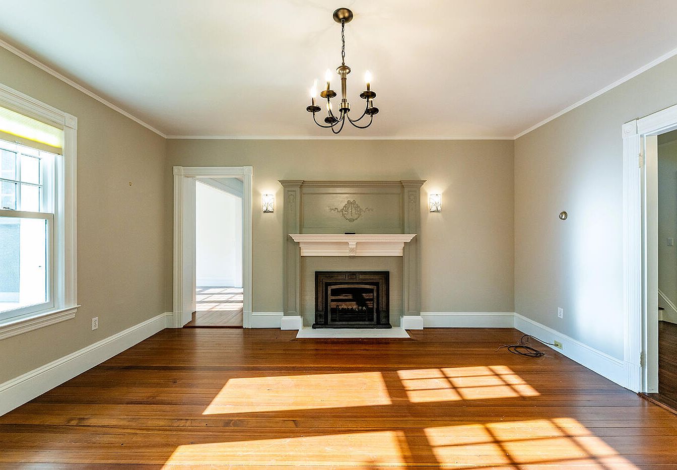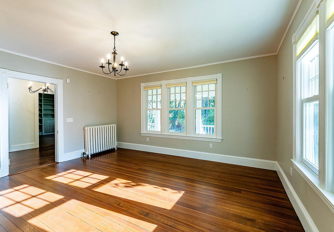 This living room showcases a generous layout with rich hardwood floors and a warm, neutral palette on the walls. Natural light pours in through sizeable multi-paned windows dressed with soft yellow shades. A classic chandelier with multiple bulbs hangs from the ceiling, providing elegance and practicality. A vintage-style radiator adds character against the wall. Crisp white trim and crown molding enhance the home’s vintage appeal. An open entryway leads to a cozy nook, suggesting thoughtful flow throughout the residence.