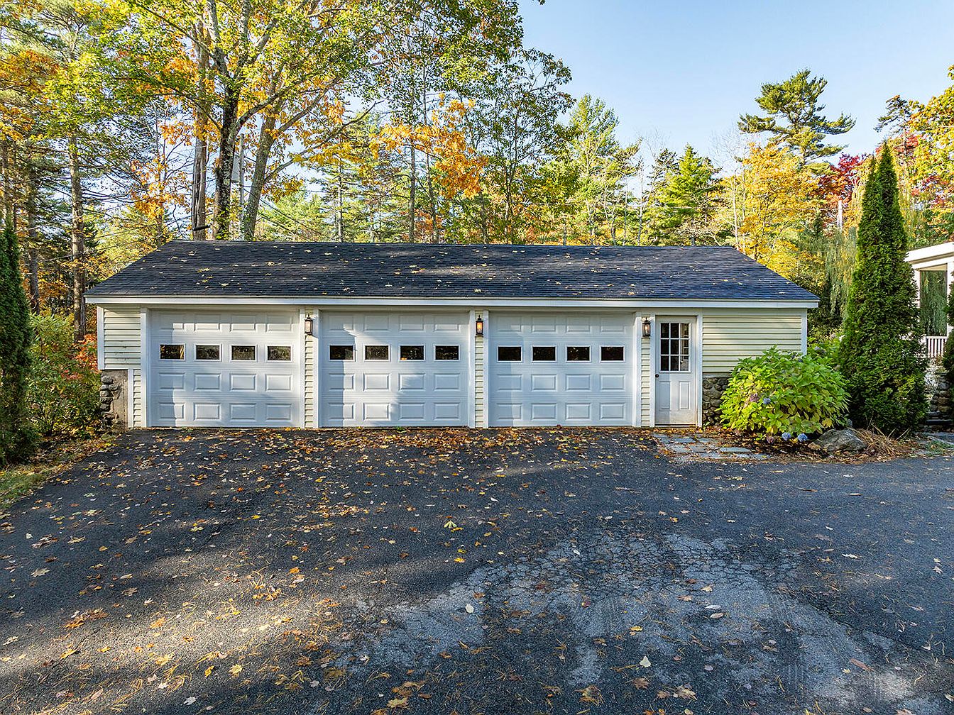 The garage showcases a traditional design with three white, paneled doors, each featuring square glass windows for light. Tall evergreen trees flank the structure, providing a natural backdrop with autumn foliage along the driveway. The building has a gently sloped roof in dark shingles and yellow siding that harmonizes with the surrounding landscape. A side door offers additional entry, while natural stone accents at the base enhance its rustic charm. The overall look blends seamlessly with the surrounding greenery and seasonal colors.