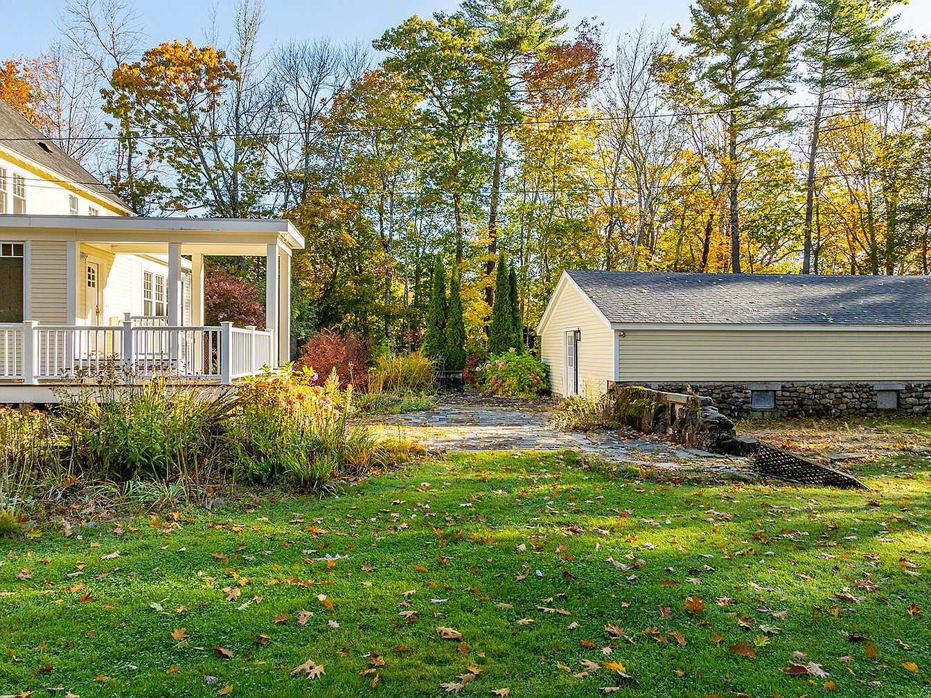 The backyard presents a tranquil outdoor space bordered by vibrant autumn foliage. A well-kept lawn leads to a stone patio, offering a rustic feel with irregular natural stone patterns. The house features a classic porch with white railings, underscoring a welcoming aesthetic. Lush perennial plants provide color and texture to the landscape. In the distance, a detached garage with a simple gabled roof balances the scene. Natural light filters through the trees, highlighting the warm tones of the leaves and the overall peaceful atmosphere, ideal for gatherings.