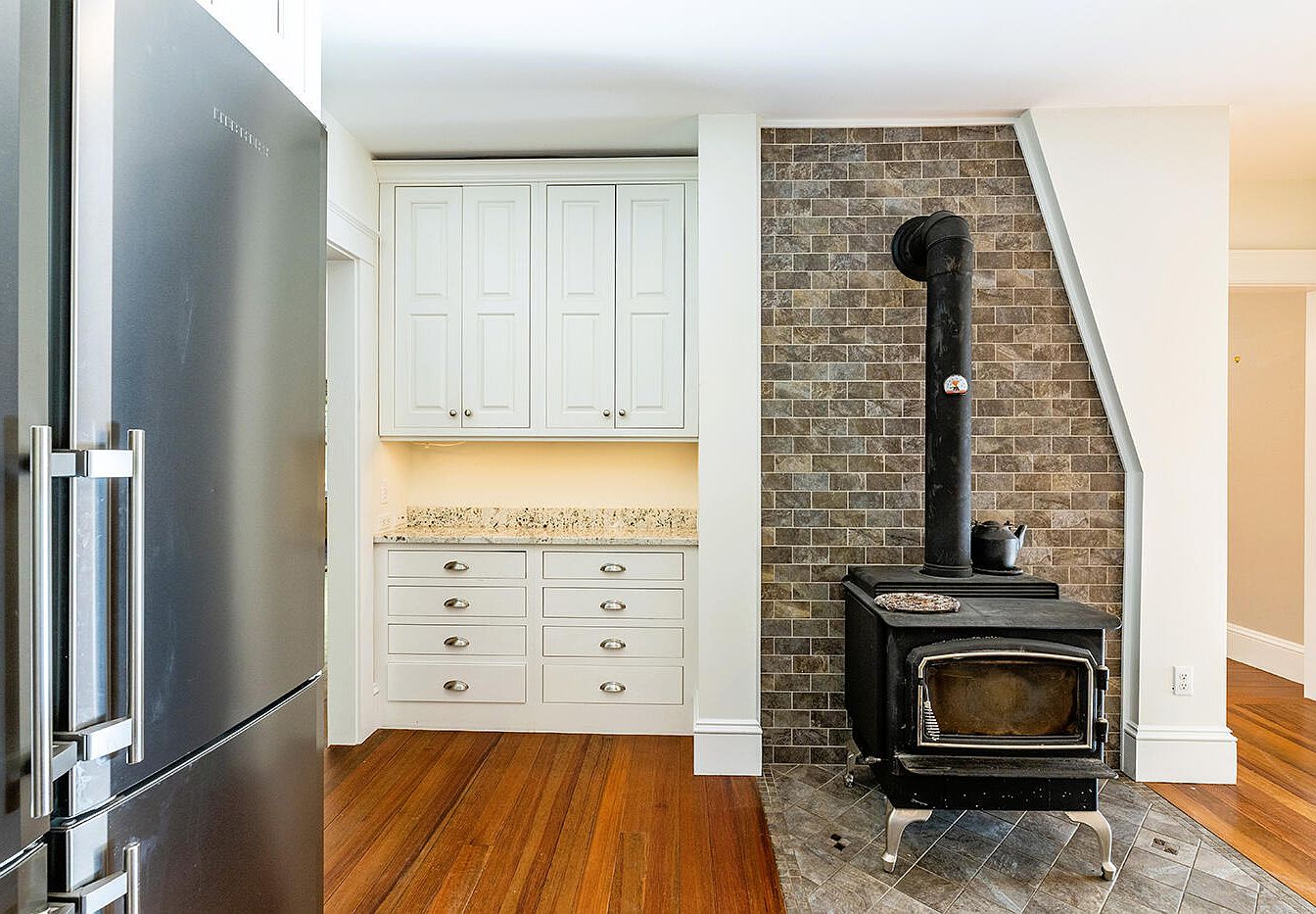 A cozy culinary area featuring a prominent black wood stove set against a textured brick wall in earthy tones. Nearby, light-toned cabinetry with tasteful hardware creates a welcoming look. Speckled granite countertops harmonize with the cabinetry, offering practical workspace. A polished wooden floor adds warmth, reinforcing a traditional feel. The stove’s sleek black chimney pipe draws attention, and a small decorative item sits atop the stove. Natural light brightens the space, reflecting off surfaces to produce a comfortable, functional environment.