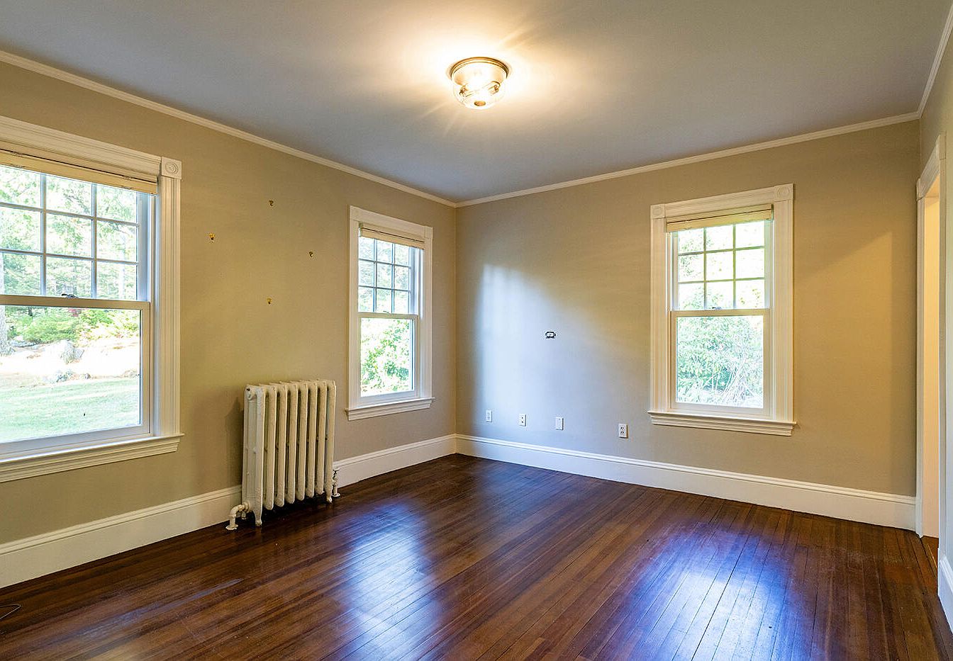 This room offers a minimalist setup with warm hardwood flooring. The walls are a soft beige, creating a neutral backdrop that complements the natural daylight streaming through two symmetrically placed windows. Each window features white trim that emphasizes the period character. An antique-style radiator is positioned along one wall, adding vintage charm. The ceiling hosts a simple yet elegant light fixture, introducing a hint of modernity. Minimal decorations invite personalization while preserving a tranquil atmosphere.