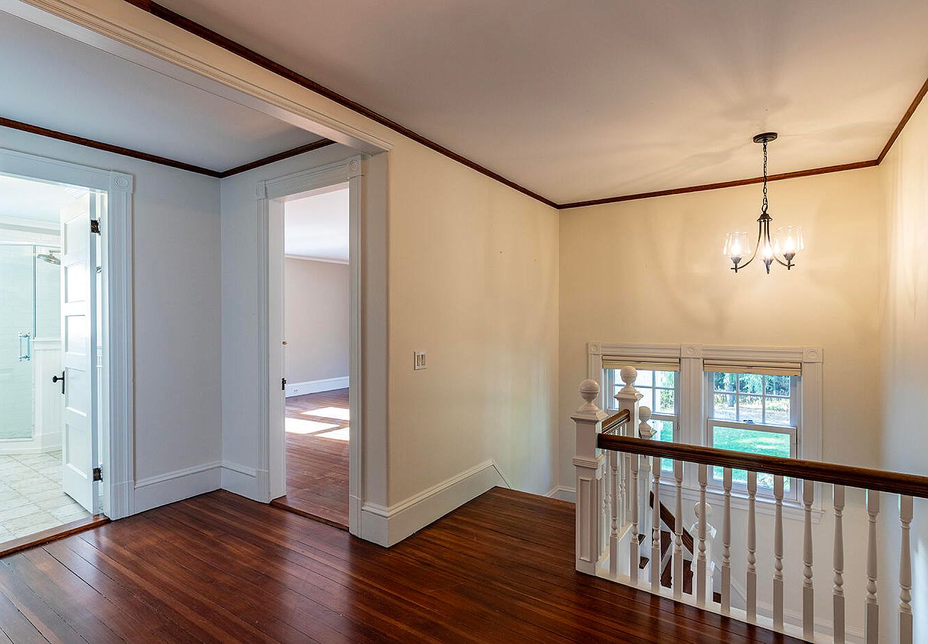 This area features polished hardwood flooring that provides warmth and texture, paired with light-colored walls. A chandelier hangs from the ceiling, offering soft illumination. Two doorways are visible; one leads to a bathroom with glass doors, while the other opens to a bright room in the background, suggesting a well-connected floor plan. The wooden handrail of the staircase provides an elegant transition to lower levels, supported by white spindles that lend a classic touch. Large windows invite natural light, enhancing openness and framing outdoor views.