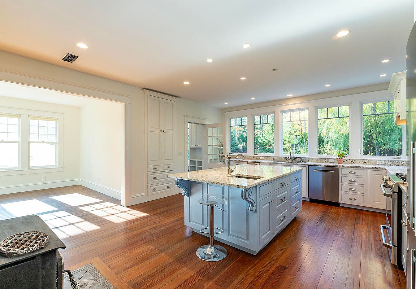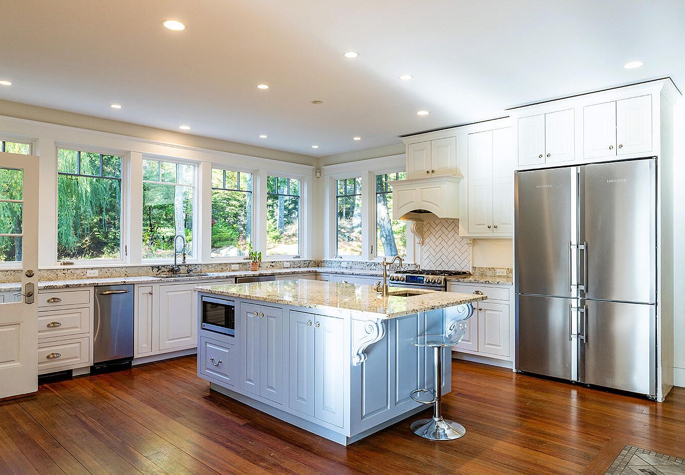 This kitchen blends contemporary and classic design in a generous footprint. A standout central island with a light blue finish and a polished granite countertop reflects daylight. White cabinetry lines the walls, creating a bright, airy feel. Large windows frame greenery outside, and warm hardwood floors run throughout. Stainless steel appliances align with the cabinetry, while recessed lighting elevates the ambiance. The overall atmosphere invites cooking and entertaining with a timeless appeal.