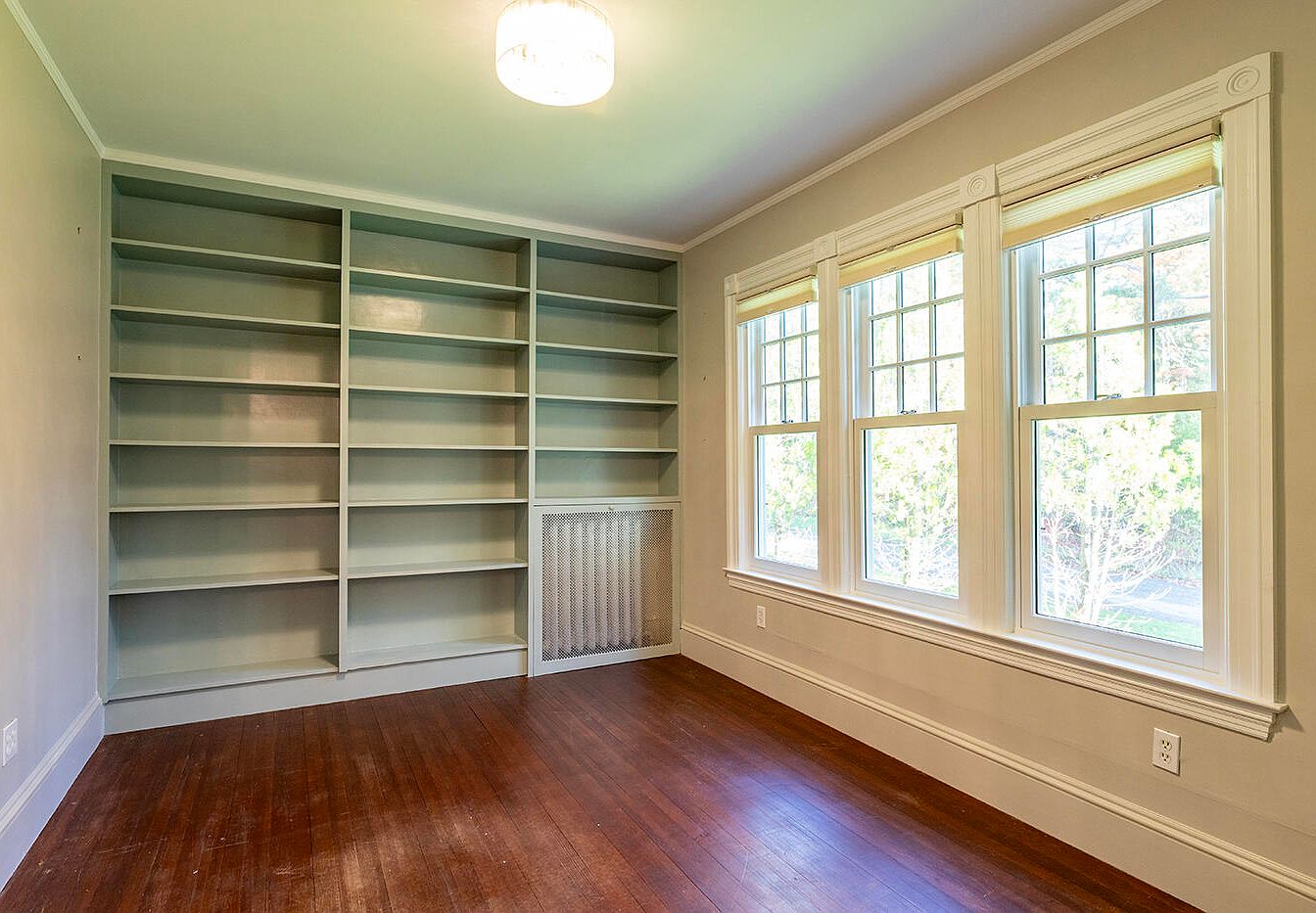 A cozy study area with pale green walls that foster a calming mood. A built-in bookcase runs from floor to ceiling on the left, offering ample storage for books and decorative items. Rich wood flooring adds warmth, while three large windows dressed with soft beige blinds flood the room with light. A classic radiator sits beneath the central window, combining practicality with style. The design balances historic charm with contemporary simplicity, creating an intimate, well-lit workspace conducive to creativity and focus.