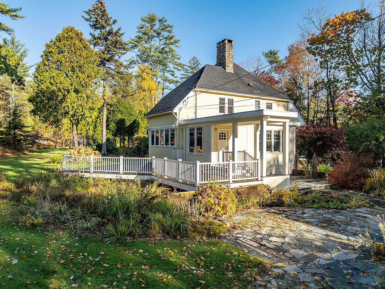 This image displays the exterior of a charming historic dwelling. The home showcases a light-toned façade with classic architectural details, including a steeply pitched roof and a stone chimney. A spacious wooden deck protrudes from the front, bordered by white railings, creating an inviting outdoor living area. Surrounding greenery and mature trees complement the serene landscape, highlighting vibrant autumn colors. A slate pathway leads to the entrance, adding texture and character. Large windows invite abundant natural light, enhancing the warm, welcoming atmosphere for outdoor gatherings and relaxation.