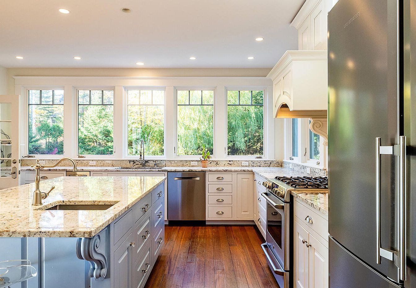 A bright and breezy kitchen characterized by expansive windows that welcome daylight. The warm hardwood floors pair with crisp white cabinetry featuring sleek handles. A sizable island with a polished granite countertop serves as the epicenter, while a tasteful herringbone backsplash in a soft shade adds visual interest. Stainless steel appliances are integrated seamlessly with the cabinetry. A deep sink with a modern faucet provides practical elegance. Potted greenery adds life, enhancing the inviting feel of this well-appointed culinary space.