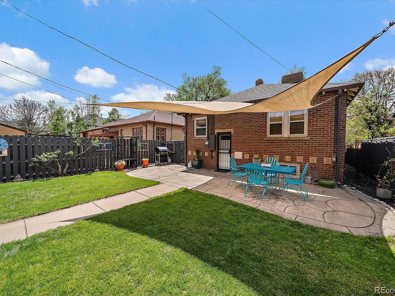 This inviting backyard patio offers a balanced blend of comfort and practicality. A stone-paved area extends from the house, providing ample space for outdoor dining with bright teal metal chairs and a matching table that add a cheerful pop of color against the neutral tones of the brick wall. A distinctive beige triangular sunshade is suspended overhead, offering relief from sunlight while creating dynamic shadows on the ground. The lush, green lawn surrounding the patio is neatly edged by a paved walkway, and a dark wooden fence encloses the yard, enhancing privacy. Potted plants and a barbecue grill complete this charming outdoor retreat.