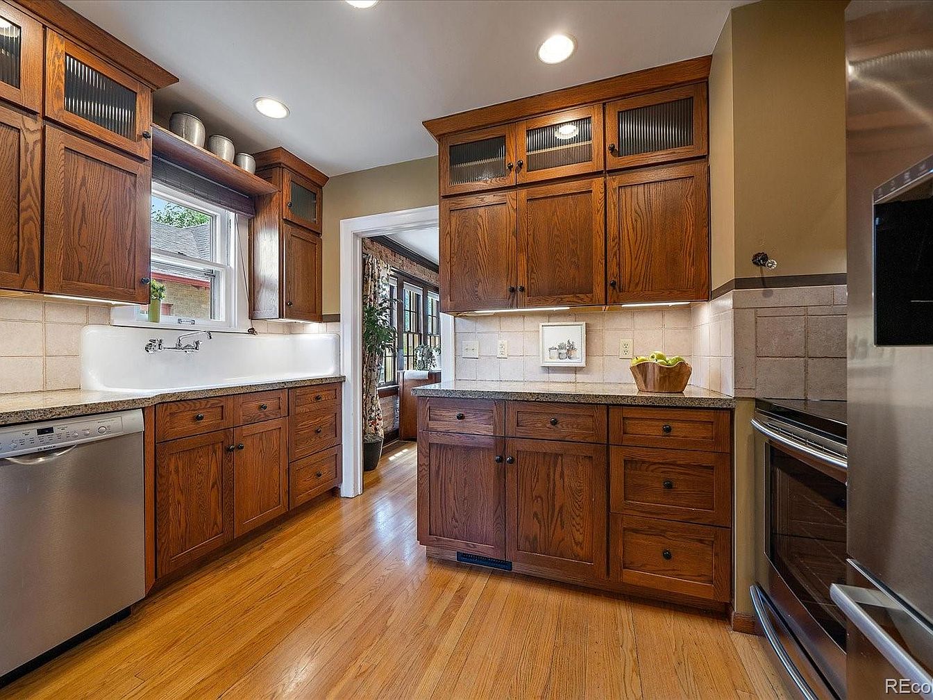 This kitchen highlights rich wooden cabinetry with a classic, warm finish that complements the polished hardwood floor. The cabinets feature a combination of solid wood and textured glass panels on the upper sections, adding subtle visual interest. A light beige tile backsplash runs along the walls, paired with granite countertops that provide a durable workspace. Stainless steel appliances, including a dishwasher and oven, introduce a modern touch to the traditional woodwork. Under-cabinet lighting softly illuminates the countertops, while recessed ceiling lights ensure ample brightness throughout. A window above the sink allows natural light to flow in, enhancing the inviting atmosphere and providing a view outside. The space opens into another room visible through a white-trimmed doorway, creating a smooth flow between areas.