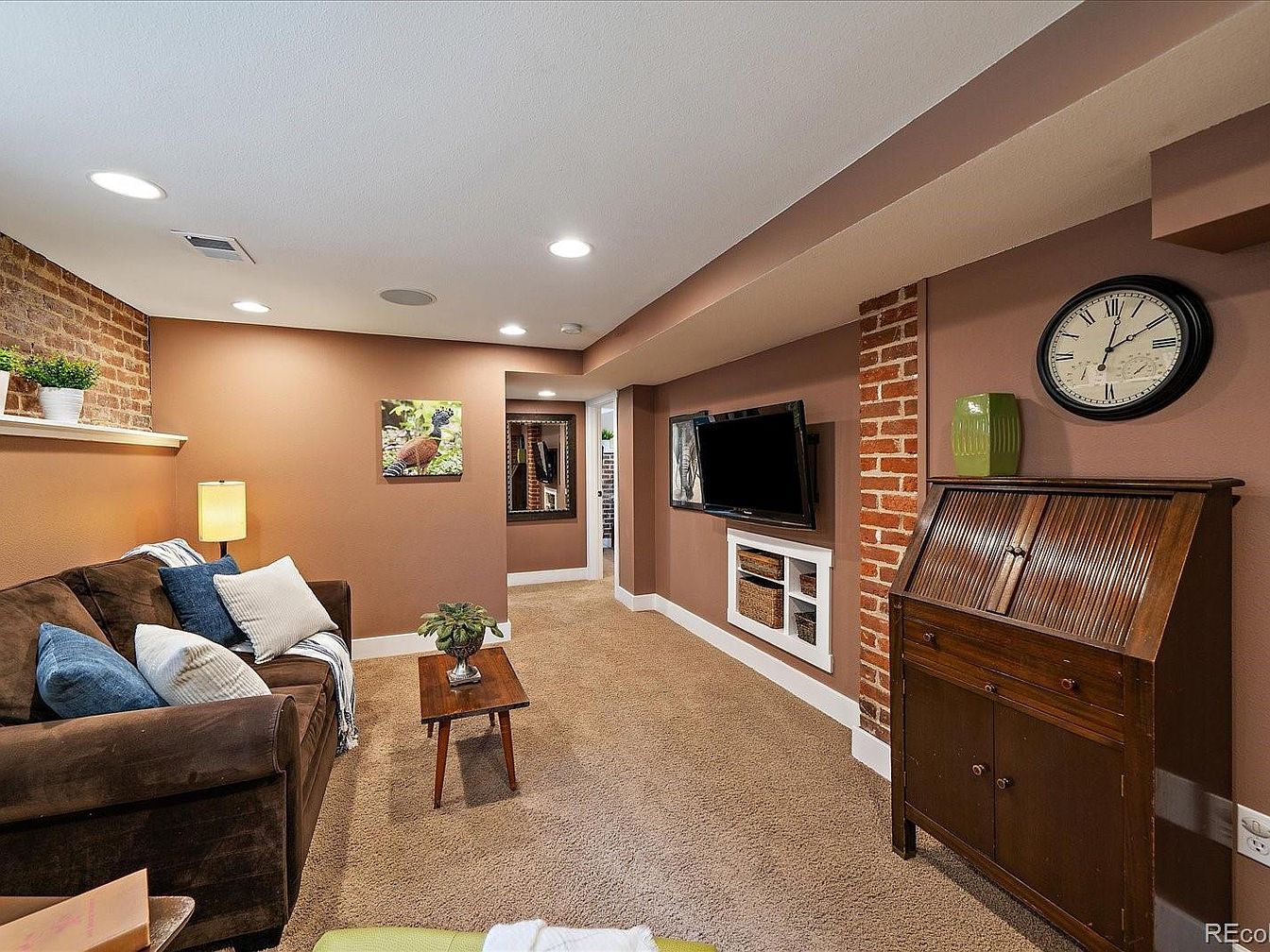 This basement lounge features a warm, earthy color palette with soft brown walls complemented by exposed brick accents, lending a rustic charm. A plush, dark brown sofa adorned with blue and white throw pillows sits against one wall, paired with a small wooden coffee table holding a potted plant for a natural touch. Recessed ceiling lights provide ample illumination. A flat-screen TV is mounted on the wall above a built-in storage nook with wicker baskets, maintaining a tidy atmosphere. An antique wooden cabinet with a clock and green vase atop creates a vintage focal point. The neutral carpet adds comfort and warmth to the space.