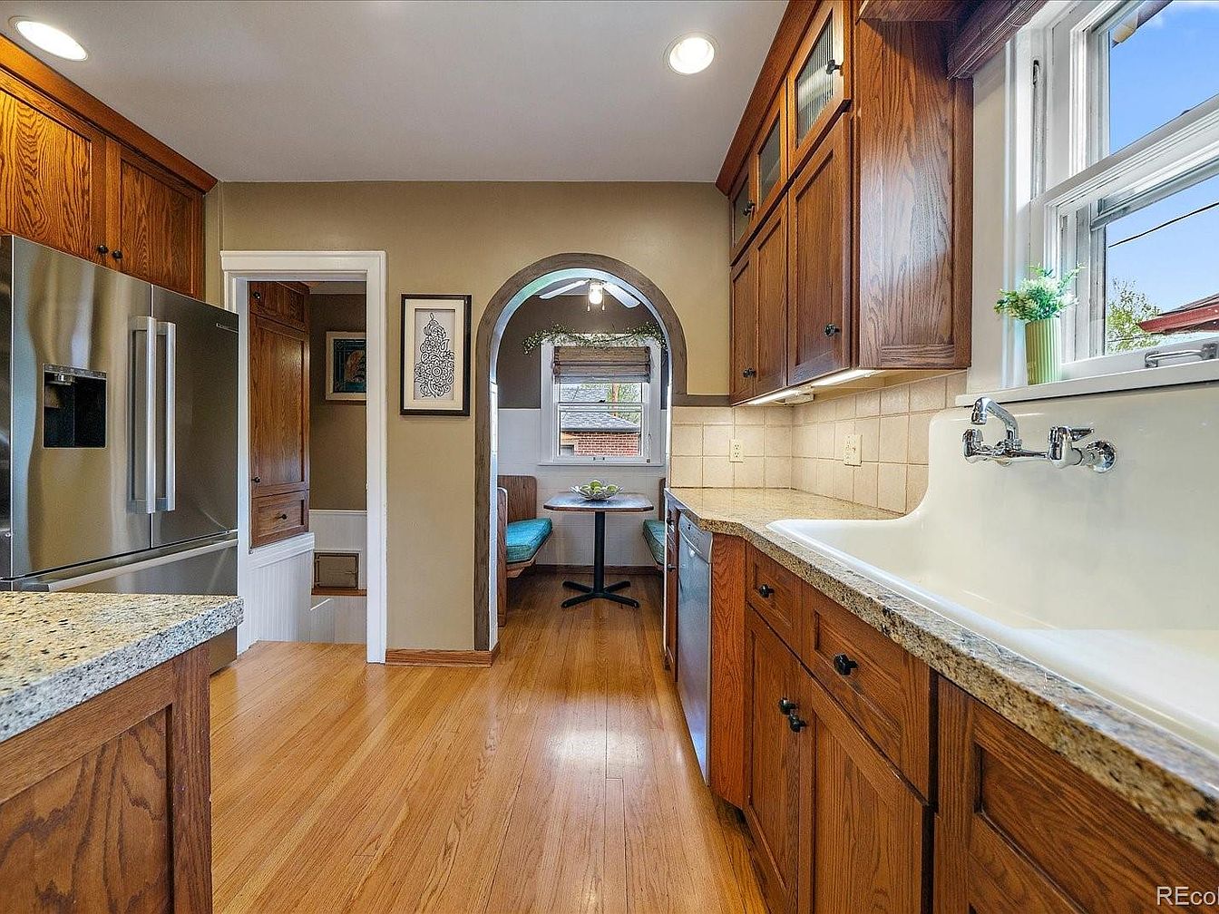 This kitchen features warm wood cabinetry with a natural grain finish, complemented by granite countertops and beige tile backsplash, creating a cozy, classic ambiance. The flooring is a smooth, light hardwood that extends through the space, enhancing its warm and inviting atmosphere. Stainless steel appliances, including a double-door refrigerator and dishwasher, add a modern touch. A large white farmhouse sink with wall-mounted faucets sits under a large window, offering plenty of natural light. Through a charming arched doorway, a built-in breakfast nook with teal cushions surrounds a small round table, providing a quaint and functional dining area.