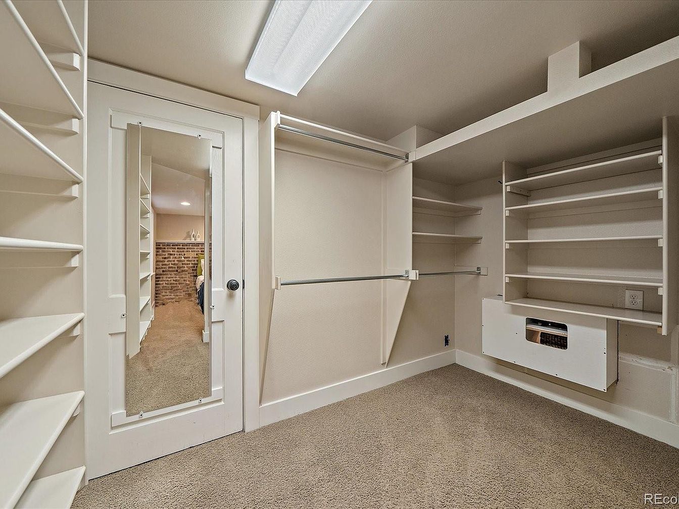 This walk-in closet presents a minimalist and functional design with ample built-in shelving and hanging rods on multiple walls for organizational ease. The neutral color palette of soft beige and cream tones creates a warm, inviting atmosphere, complemented by the plush carpeting underfoot. A full-length mirror is mounted on the inside of the door, enhancing the space’s utility while visually enlarging the room. The clean lines of the shelves and modern finishes offer a simple yet practical aesthetic that caters to efficient storage. Bright fluorescent lighting ensures the space is well-lit for ease of use.