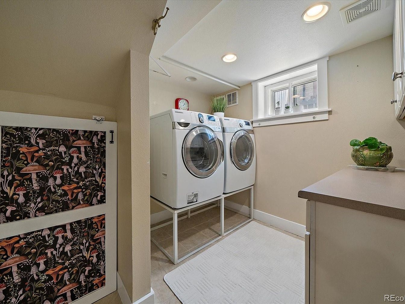 This laundry room offers a clean, functional layout with beige walls and neutral tile flooring creating a warm, inviting atmosphere. Two front-loading white washers and dryers are elevated on a sturdy metal stand for ergonomic convenience. Recessed ceiling lights provide ample illumination, complemented by natural light streaming through a small, framed window adorned with simple potted plants. Opposite the appliances, a countertop and cabinetry provide practical storage and workspace. A unique decorative panel with mushroom and foliage patterns adds a touch of whimsy and personal charm, enhancing the space’s cozy, organized aesthetic.