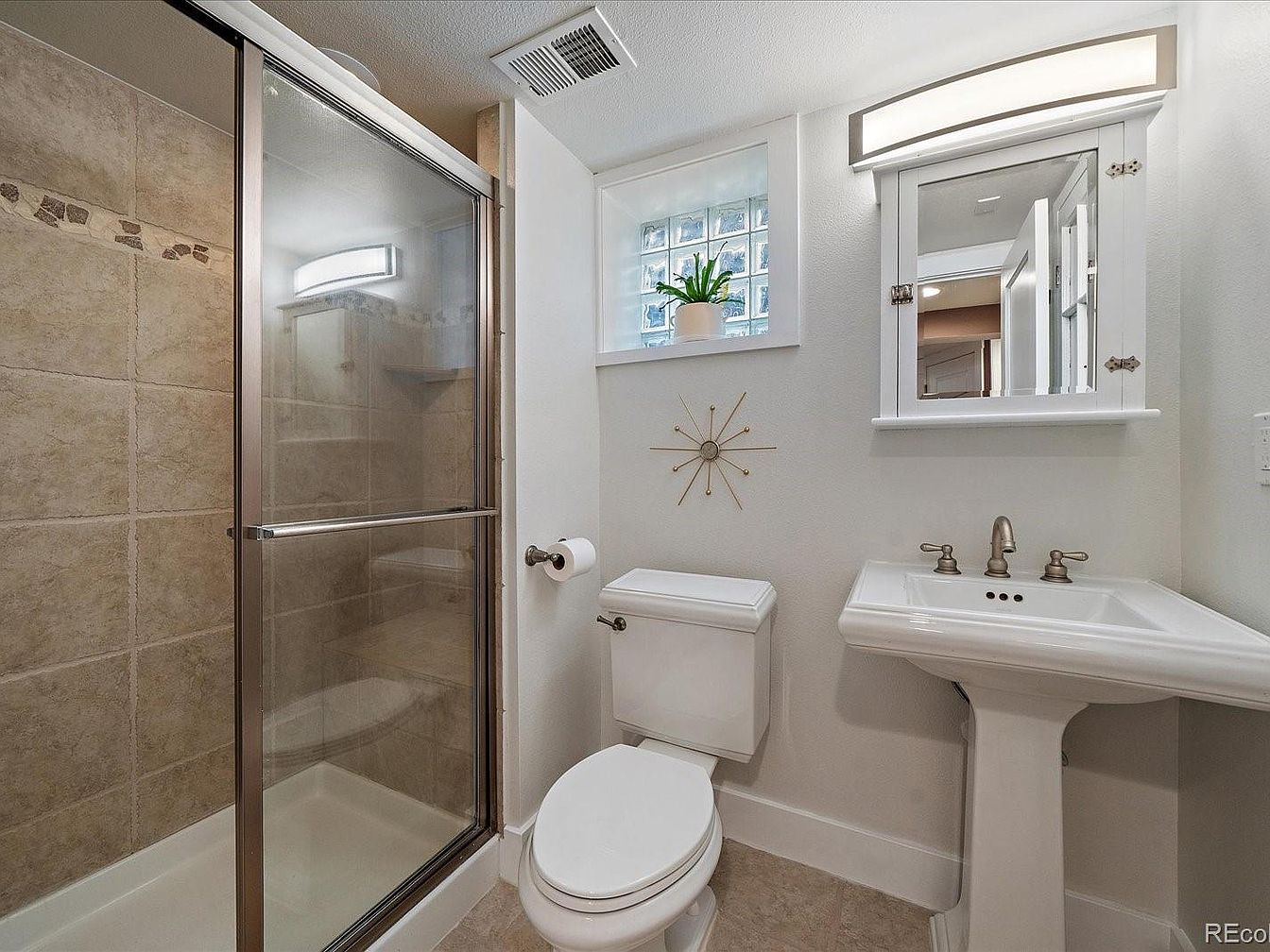 This compact bathroom combines functionality with a clean, modern aesthetic. The walk-in shower features beige tiled walls accented with a decorative horizontal strip of mosaic tiles and a sliding glass door framed in brushed metal. Adjacent to the shower, a white toilet with a traditional tank design sits beneath a small glass block window that invites natural light while maintaining privacy. A pedestal sink with classic lines and vintage-style brushed metal fixtures complements the space. Above the sink, a mirrored medicine cabinet with soft lighting provides practical elegance. A unique sunburst wall decoration enhances the simple yet inviting ambiance.