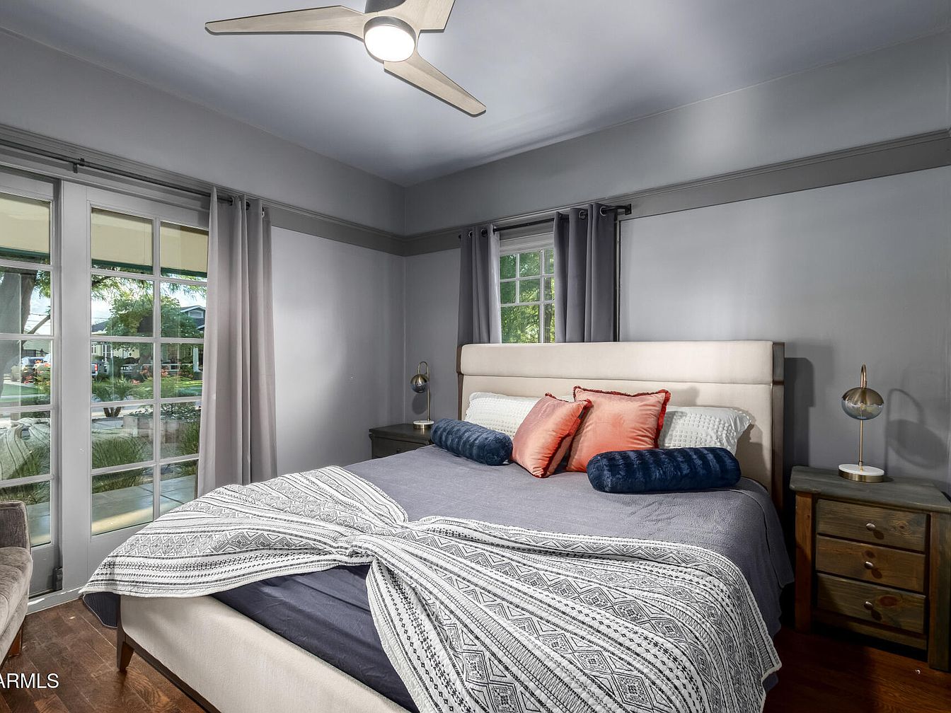 This bedroom features a calm and sophisticated color palette, with muted gray walls and matching ceiling accented by darker trim. A large beige upholstered bed anchors the room, dressed in a navy blue blanket, patterned throw, and a mix of coral, white, and navy pillows, adding pops of color and texture. Two rustic wooden nightstands with brass globe lamps sit on either side of the bed. The room is illuminated by a sleek ceiling fan with a light. Floor-to-ceiling windows and French doors bring in natural light, with soft gray curtains framing the view of the garden outside. Hardwood floors enhance the warm ambiance.