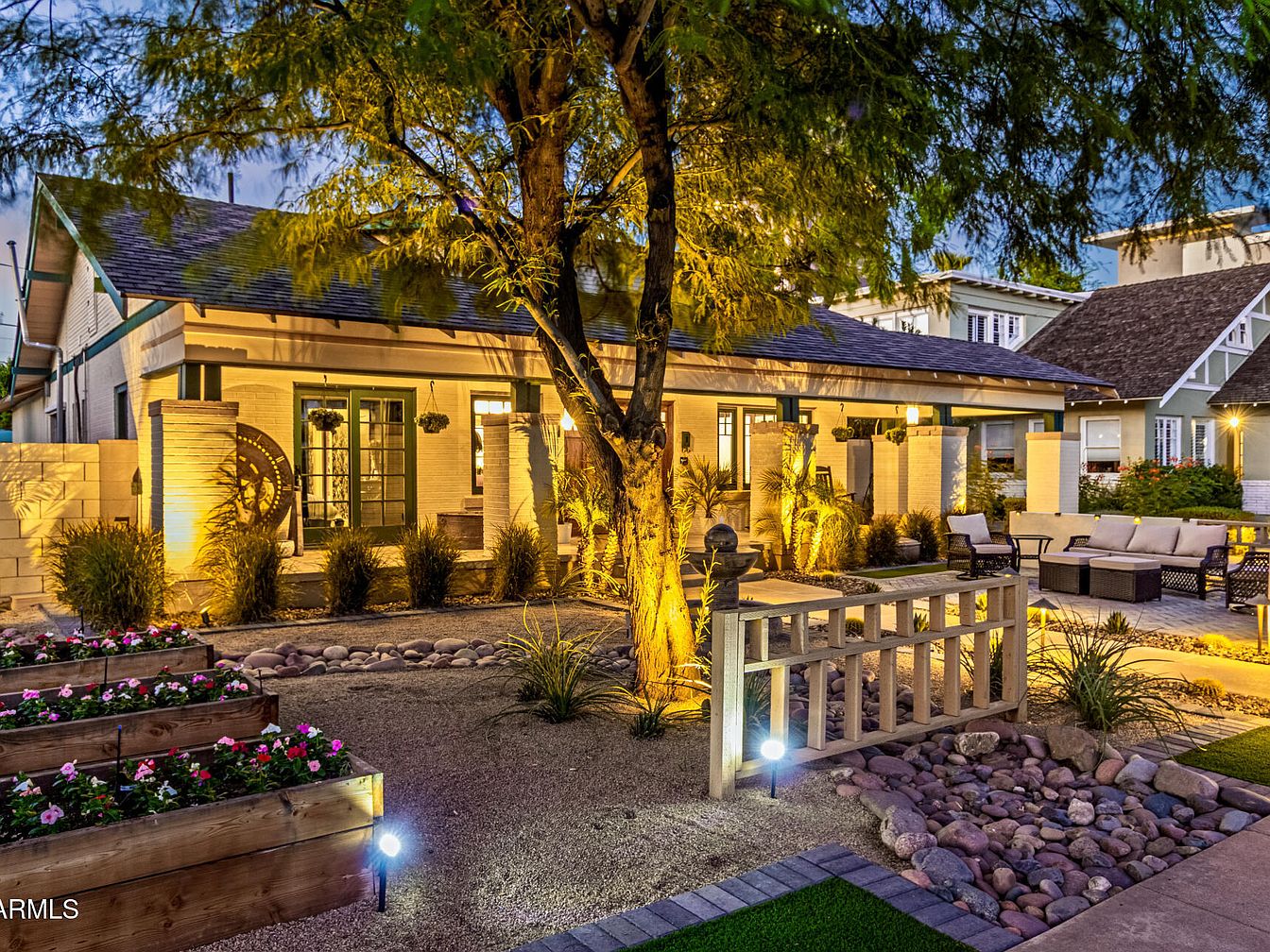 A beautifully landscaped front yard leads to a historic American home’s entrance at twilight. Raised wooden flower beds filled with vibrant pink and white blooms are placed along one side, while a charming wooden fence and rock-lined garden path invite visitors toward the house. Soft, warm lighting highlights architectural details including creamy white brick pillars and deep green trim around the French doors and windows. Outdoor seating with cushioned chairs and a sofa sits on a paved patio area. Mature trees create a shaded canopy, adding to the tranquil and welcoming atmosphere of the garden entry.