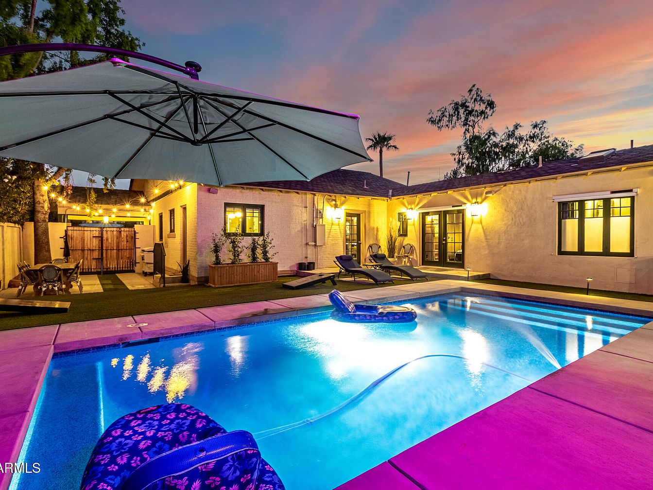 A serene outdoor retreat features a sparkling rectangular swimming pool bordered by smooth stone decking. Bright blue pool water is accentuated by technicolor pool lights and a sunset sky with hues of pink, purple, and orange. On one side, a large umbrella partially covers cushioned lounge chairs arranged neatly for relaxation. Nearby, a wooden outdoor dining set rests under string lights, creating a cozy ambiance. Raised planters with greenery and symmetrical black-trimmed windows punctuate the cream stucco exterior of the historic home, and soft wall sconces add warmth to the inviting evening atmosphere.