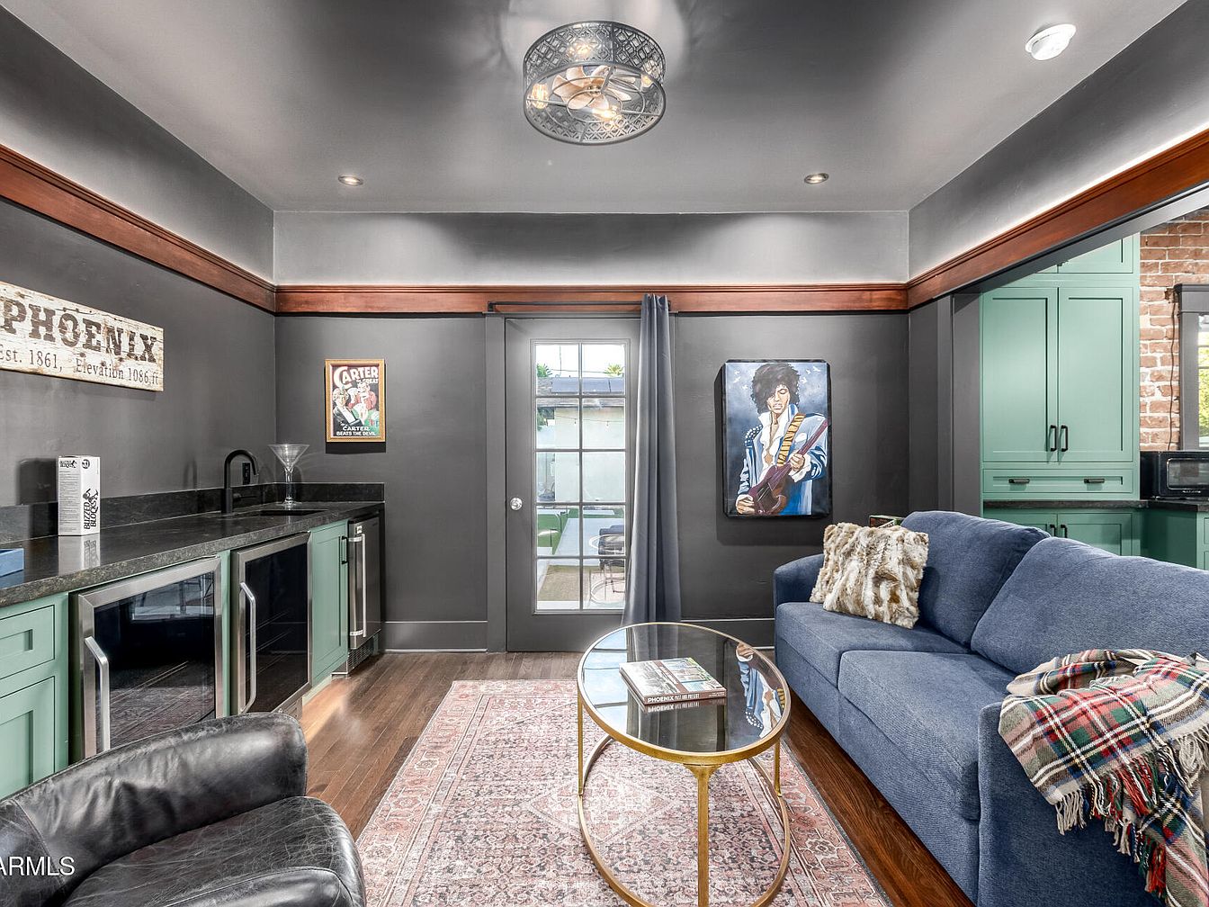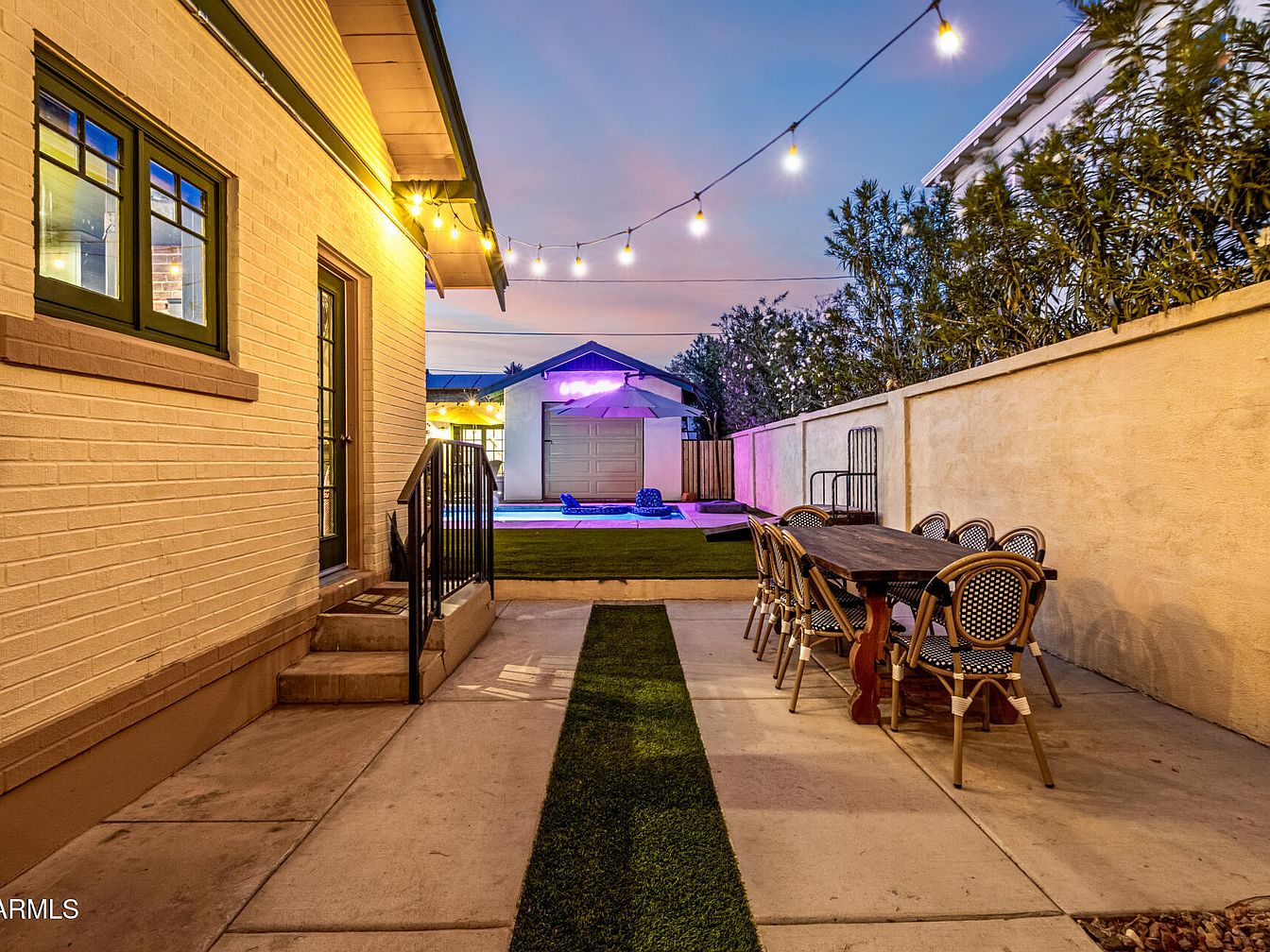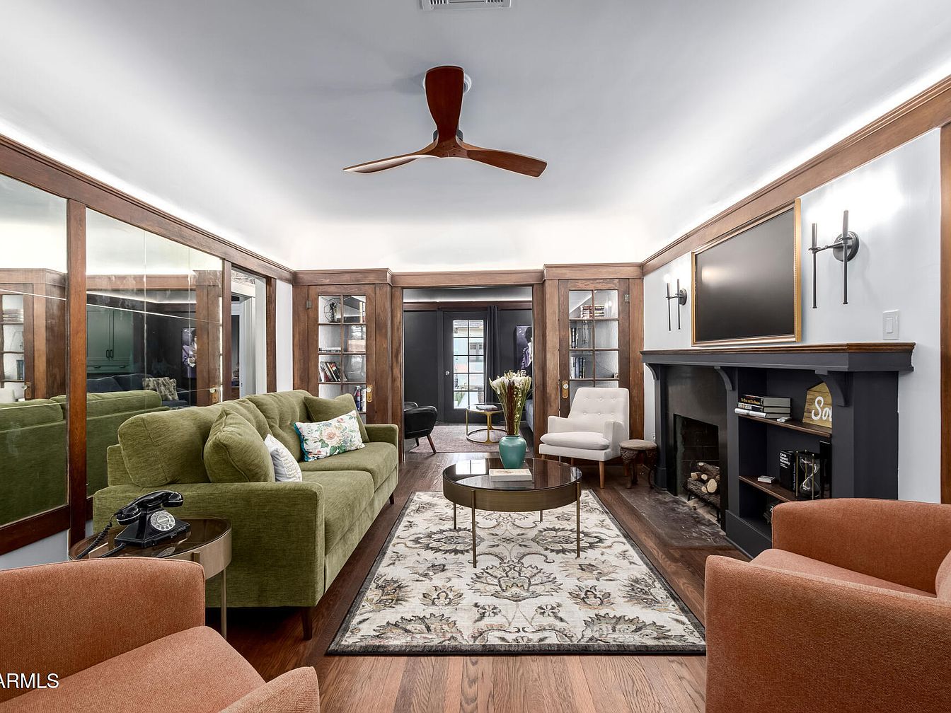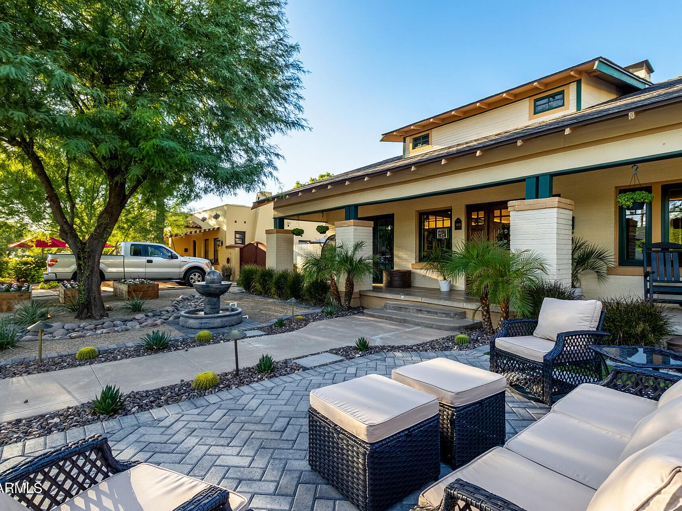 The Walter Stone House, situated in the Willo Historic District of Phoenix, AZ, is a stunningly restored Craftsman bungalow with over a century of history, embodying the charm and architectural significance of early 20th-century American homes. Built over 100 years ago, this residence boasts preserved original hardwood floors, elegant custom millwork, two fireplaces, and striking mirrored walls reputedly installed by Frank Lloyd Wright. Recent renovations include modernized kitchens and baths with high-end appliances, designer finishes, and stone counters. This rare property offers a spacious front porch and lavish landscaping on a private cul-de-sac lot, complete with a guest house, pool, spa, and 1.5-car garage, all listed at $1,249,900 near downtown Phoenix. Plot size and total square footage are not specified.