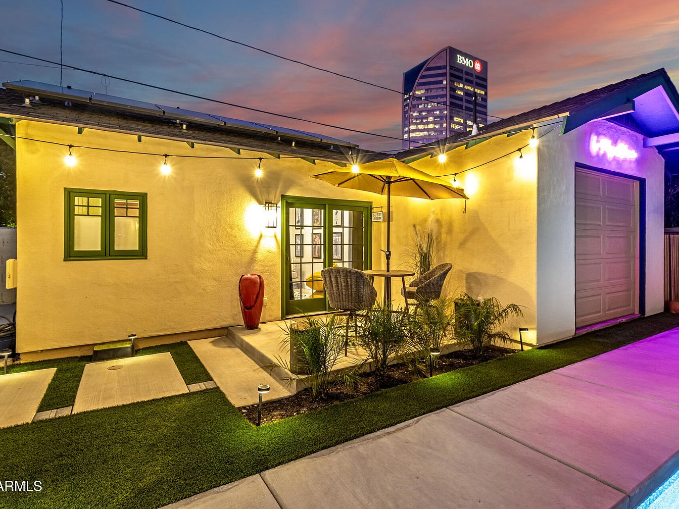 A cozy outdoor patio is nestled against a historic home with smooth cream stucco walls and green window and door trim. String lights hang overhead, casting a warm glow that enhances the relaxed evening ambiance. The patio space features a small round dining table with two wicker chairs beneath a large yellow umbrella, providing shade and comfort. Potted plants and a low row of foliage soften the edges of stamped concrete and manicured artificial turf. The attached garage door, modern sconce lighting, and a contemporary high-rise building in the background lend an urban yet inviting atmosphere to this tranquil outdoor retreat.