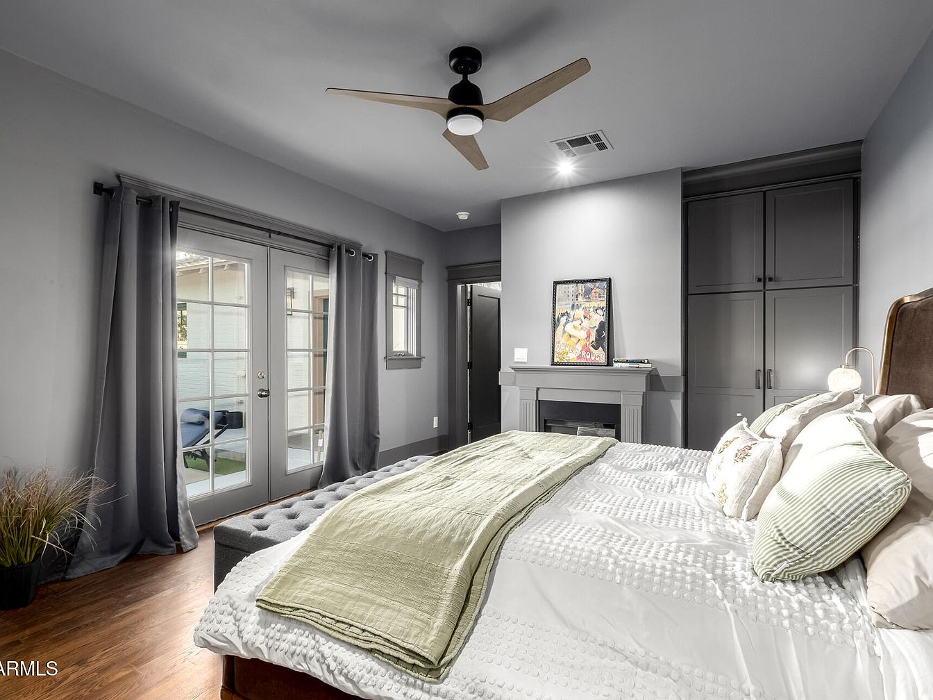 This bedroom features a soothing gray color palette with light gray walls, drapes, and matching built-in cabinetry. Double French doors with multiple glass panes open to an outdoor area, letting in natural light and providing a seamless indoor-outdoor connection. A bed with crisp white linen, textured bedding, and green-accented pillows is centered in the room. At the foot of the bed sits a tufted bench. Above the mantelpiece, a framed artwork adds a touch of personality, and a modern ceiling fan with wood-toned blades hangs overhead. Warm wood flooring softens the cool tones for a balanced, inviting atmosphere.