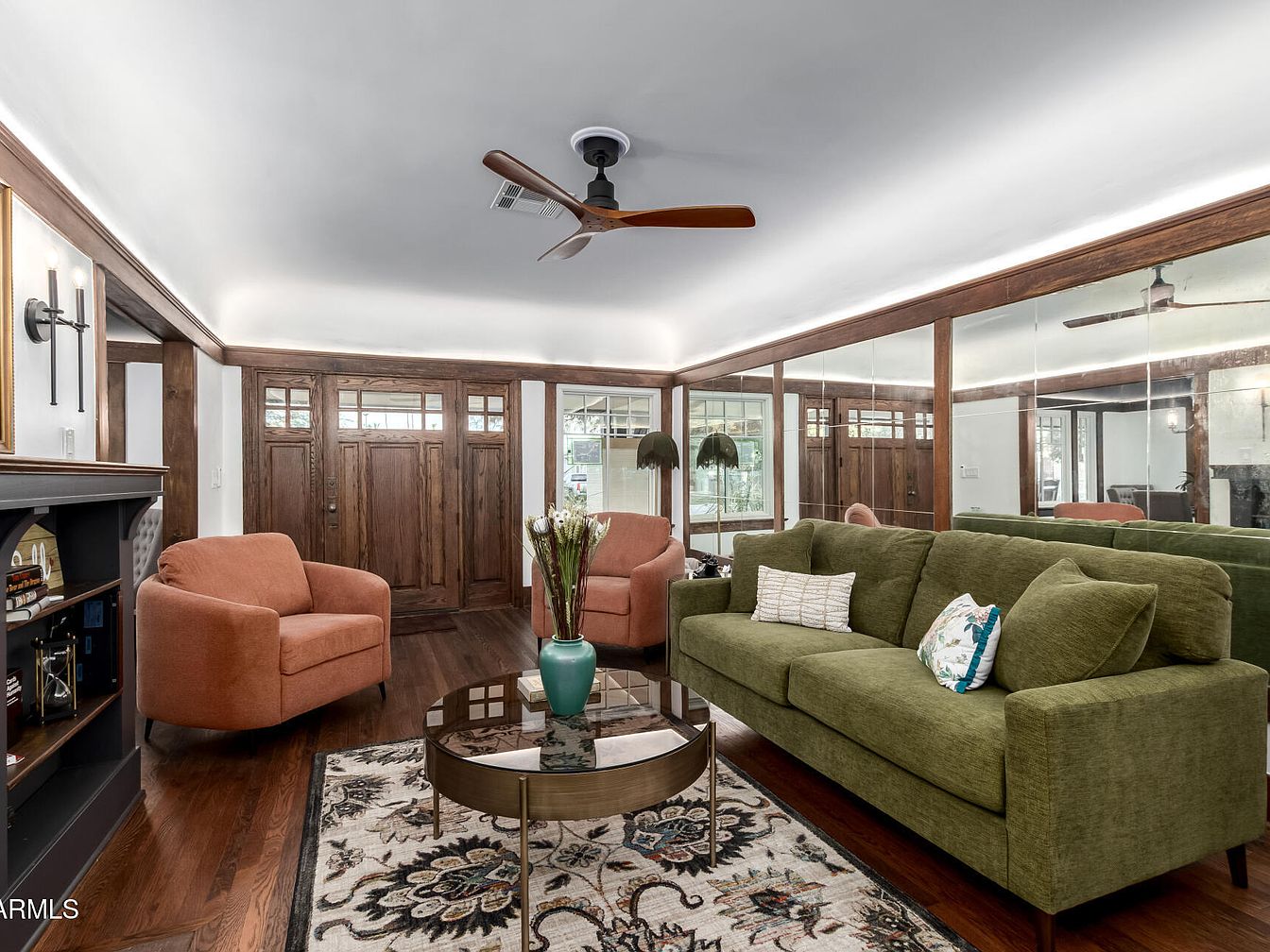 A spacious living room with rich wood trim framing the large wooden front door, which features rectangular glass panes. One wall is covered with a floor-to-ceiling mirror, visually expanding the space. The floor is dark hardwood, complemented by a patterned cream and navy area rug. A soft olive green sofa with assorted throw pillows and two burnt orange armchairs create a comfortable seating arrangement around a round brass and glass coffee table. Bookshelves and a stylish black fireplace add character, while a modern wood-blade ceiling fan and subtle cove lighting along the ceiling create a warm, inviting ambiance.