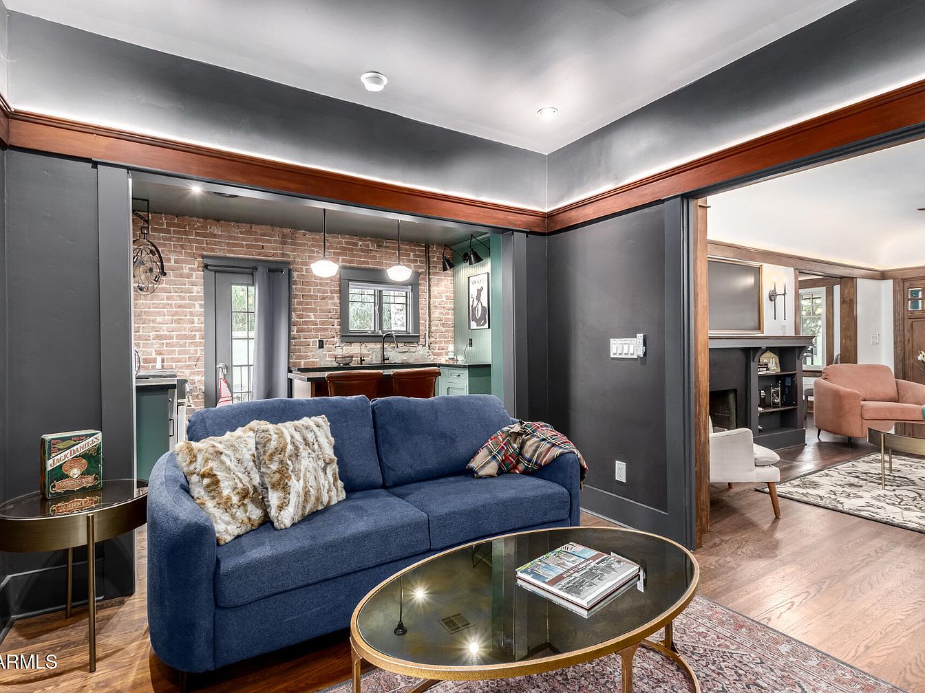 This cozy living room features a deep blue plush sofa adorned with a soft, patterned throw pillow and blanket. A round glass coffee table with gold trim sits in front, holding a few magazines. The space is bordered by dark gray walls with rich wood accents near the ceiling and around doorways, enhancing the historic character. An open threshold seamlessly connects the living room to a kitchen with exposed brick walls, green cabinetry, double pendant lights, and a windowed door. Adjacent lies a sitting area with soft peach chairs and a fireplace, all grounded by hardwood flooring and patterned rugs for warmth and texture.