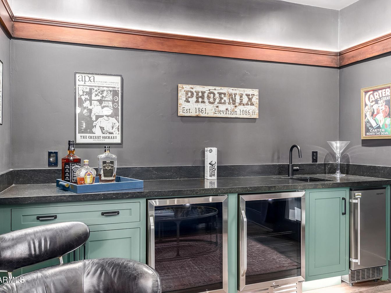 A chic home bar features muted green cabinetry with modern black hardware, paired with a glossy black stone countertop and matching backsplash. Two under-counter glass-front refrigerators and a small beverage cooler add a modern touch, while a black sink with a sleek faucet sits to the right. The walls are painted deep gray, accented by a natural wood crown molding. Vintage posters and a distressed wooden sign reading ‘PHOENIX’ lend an eclectic and personalized feel. A stylish black leather chair partially appears in the foreground, contributing to the inviting, lounge-like ambiance of the space.