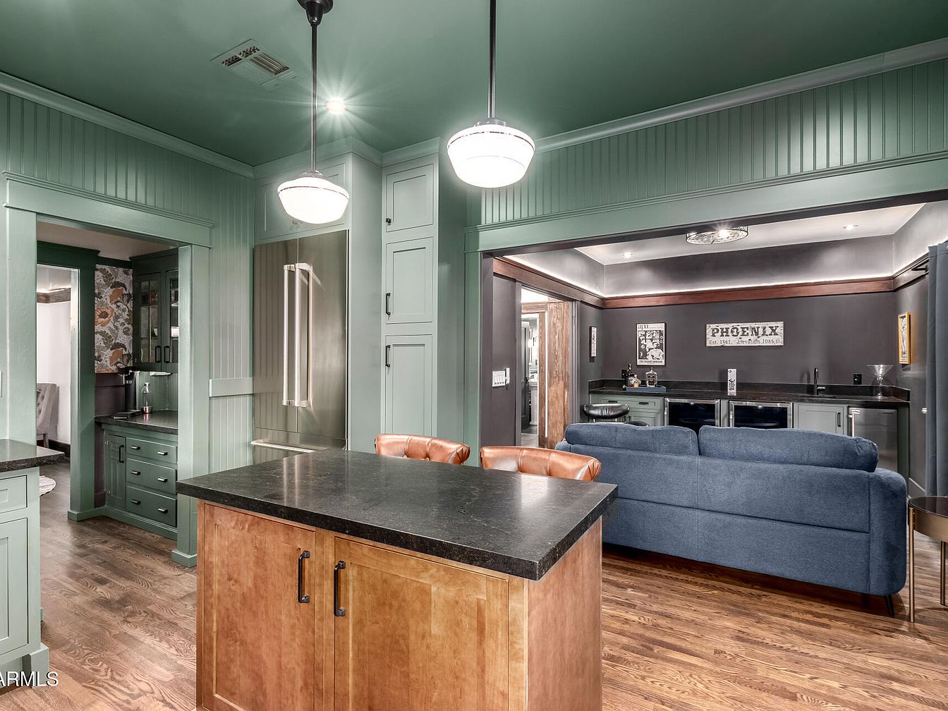 A striking open-plan layout connects a kitchen to a lounge area. The kitchen features paneled sage green cabinets and walls, a matching ceiling, and beadboard trim for a classic touch. The center island hosts a black stone countertop and warm natural wood cabinetry below, while pendant lights with globe shades hang above. Wide-plank wooden floors unify the spaces. Moving to the lounge, a deep blue velvet sofa faces a charcoal wall with a ‘Phoenix’ sign and vintage art. Glass-front cabinets and a pair of undercounter refrigerators add to the lounge’s sleek, inviting ambiance.