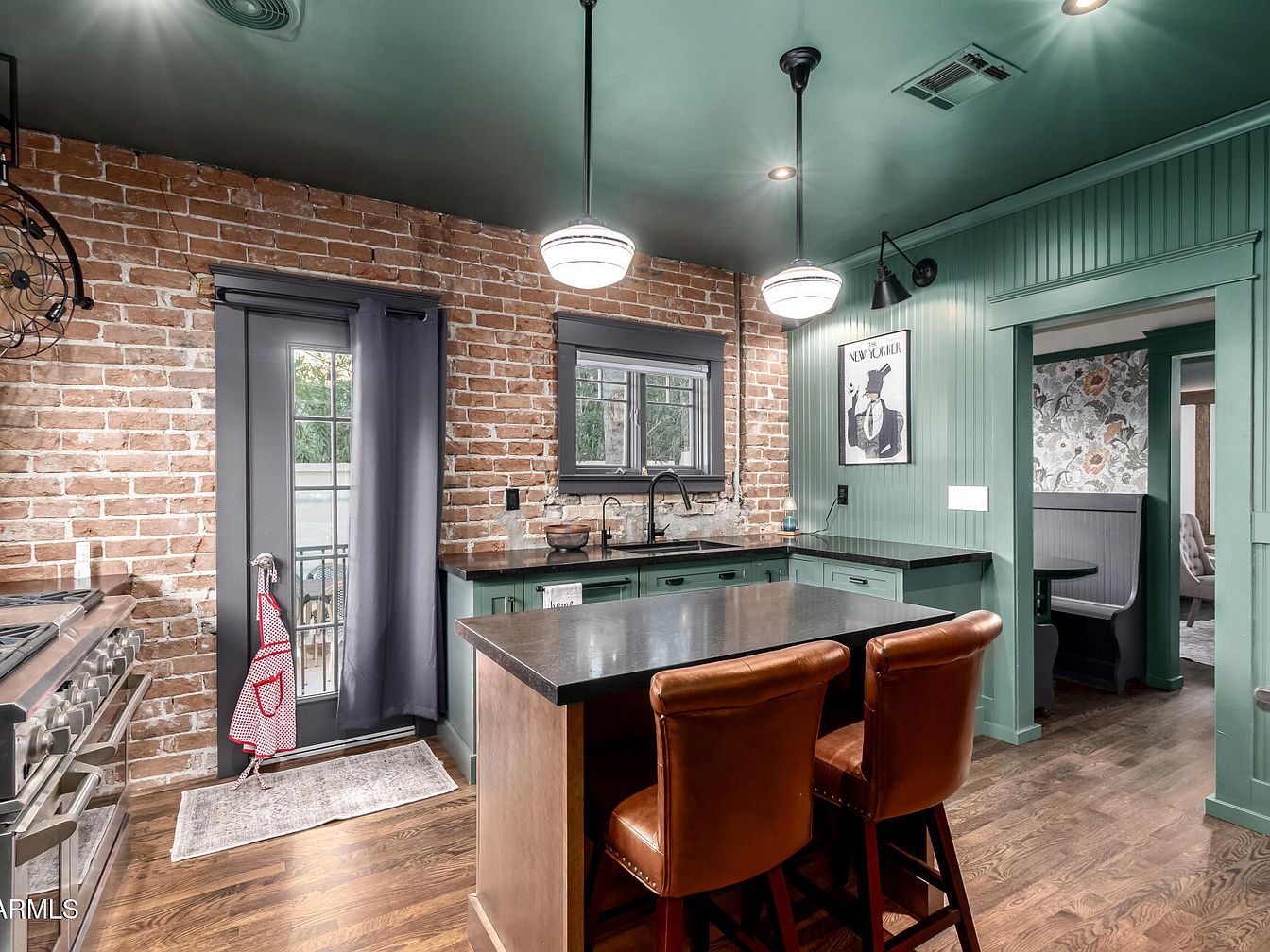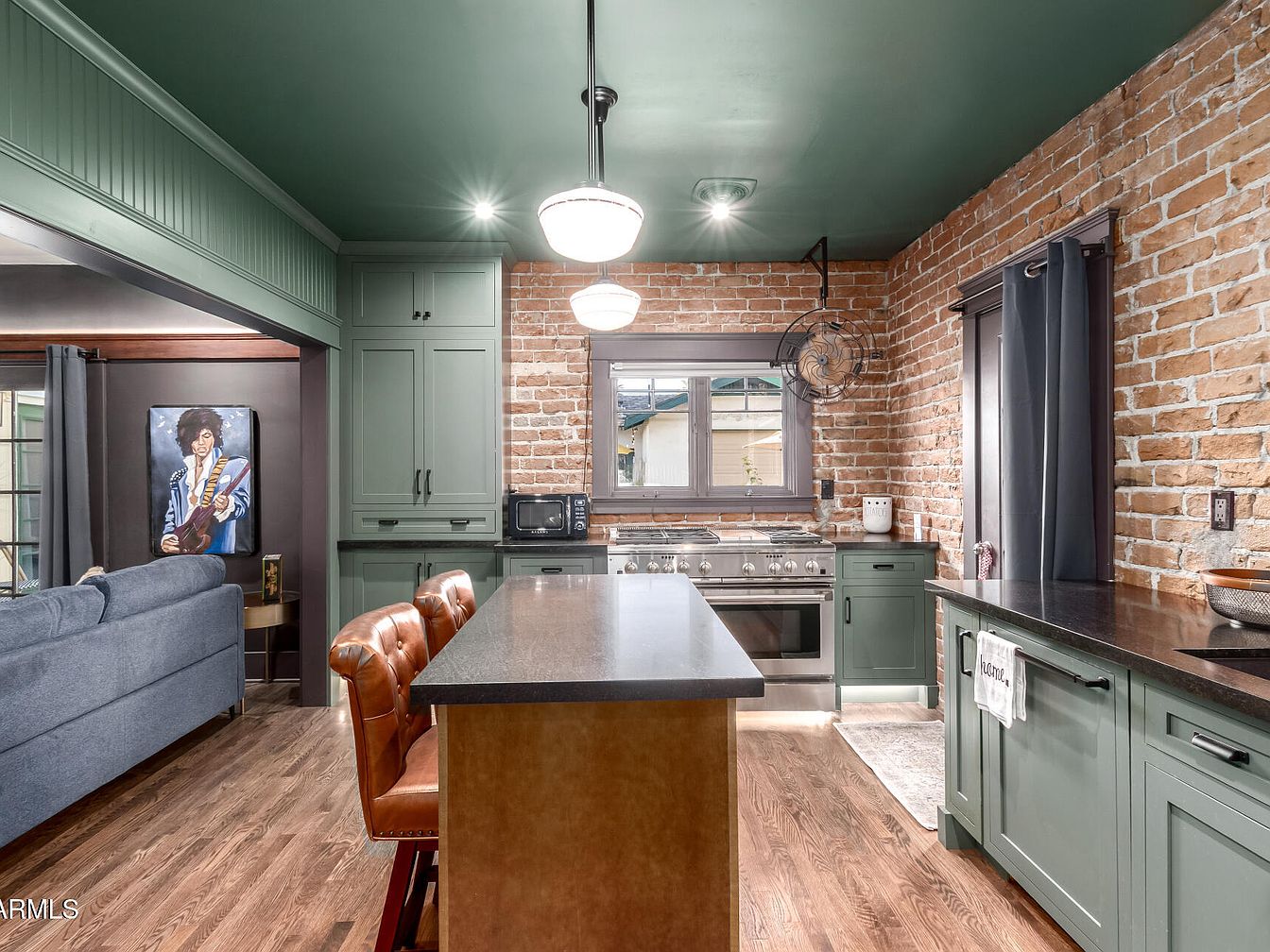 Exposed brick walls add texture and warmth to this kitchen, blending seamlessly with sage green cabinetry and a deep green ceiling. A central island with a dark countertop is paired with two caramel leather bar stools, offering seating and workspace. Stainless steel appliances, including a professional range beneath a wide window, enhance a sense of modern functionality. Pendant lighting casts soft illumination, highlighting the natural wood floors that flow from the kitchen into the adjacent living area. Dark window trim and cabinet hardware provide contrast, while art and cozy details create a welcoming, stylish atmosphere.