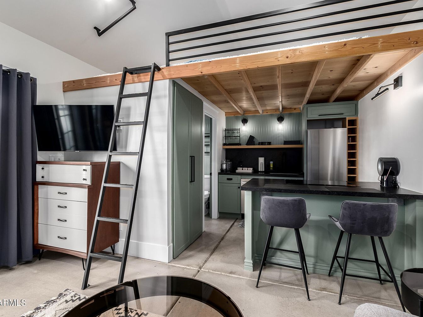 A compact, modern kitchen with a loft above is visible. The lower area features sage green cabinetry and wainscoting, accented by matte black hardware and a matching black countertop on a breakfast bar with two gray velvet barstools. To the right stands a stainless steel refrigerator, and a small open wine rack. The kitchen’s sleek surfaces contrast with the rustic, light-wood ceiling above. A black metal ladder provides access to the loft space. On the left, a white and wood dresser sits under a wall-mounted flat-screen TV, and dark drapes frame the area for privacy. The overall palette blends muted greens, natural wood, black, and touches of soft gray.