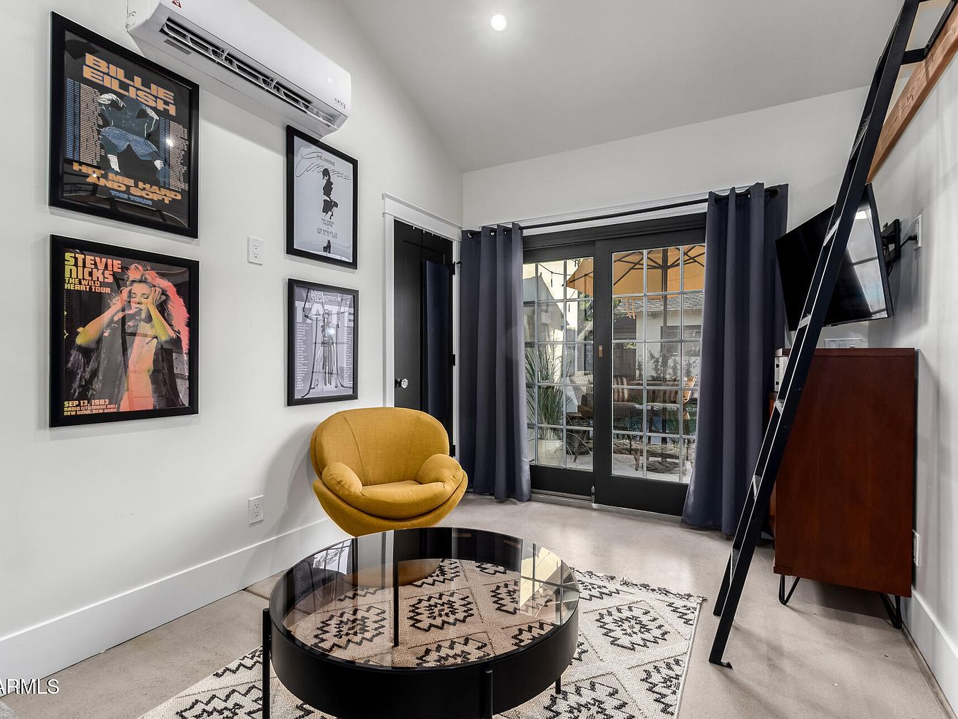 A compact and modern lounge features a cozy mustard-yellow accent chair set on a neutral geometric rug, centered beneath a circular glass coffee table. The walls are painted bright white, adorned with framed music memorabilia. A set of French doors, framed by dark curtains, opens to a patio, letting in natural light and connecting indoors to outdoors. A mounted TV and sleek wooden cabinet add functional modernity, while a black metal ladder hints at a lofted space above. The design combines musical nostalgia with mid-century and contemporary elements, creating a relaxed yet stylish location for relaxing or entertaining.