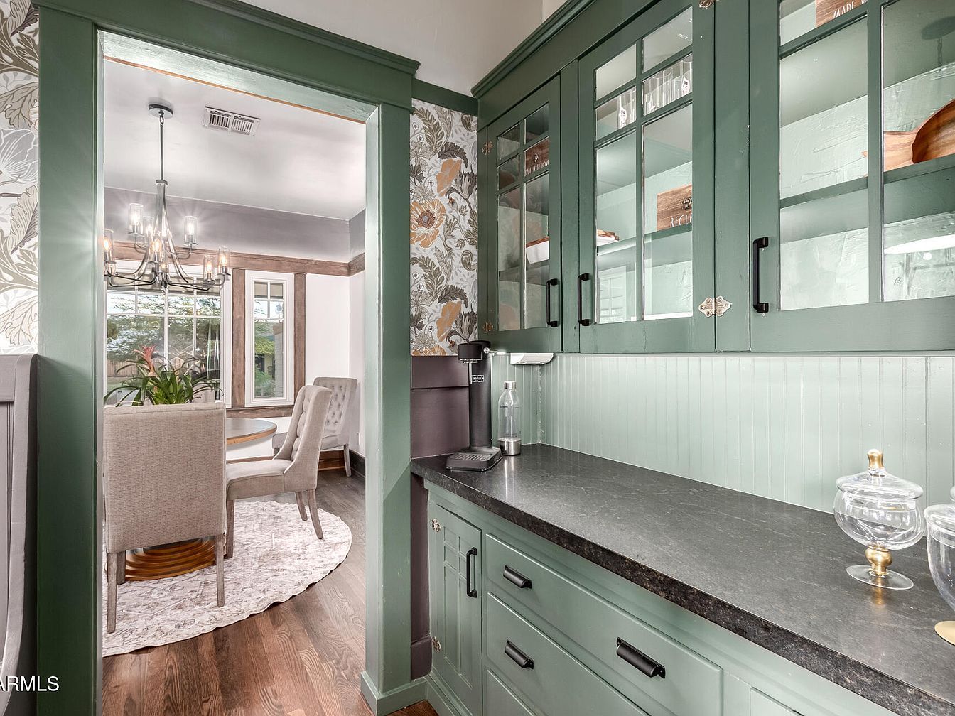 This area features a butler’s pantry with sage green cabinetry, black stone countertops, and glass-front upper cabinets displaying dishes and wooden trays. The cabinetry has retro-inspired black hardware, and the walls are accented with floral wallpaper in soft neutrals. Through the doorway, there’s a dining room with a circular wooden table, tufted upholstered chairs in a light beige fabric, and a textured area rug. The dining area is illuminated by a modern chandelier and natural light from a large window framed in dark wood, creating a blend of classic charm and contemporary style throughout the space.